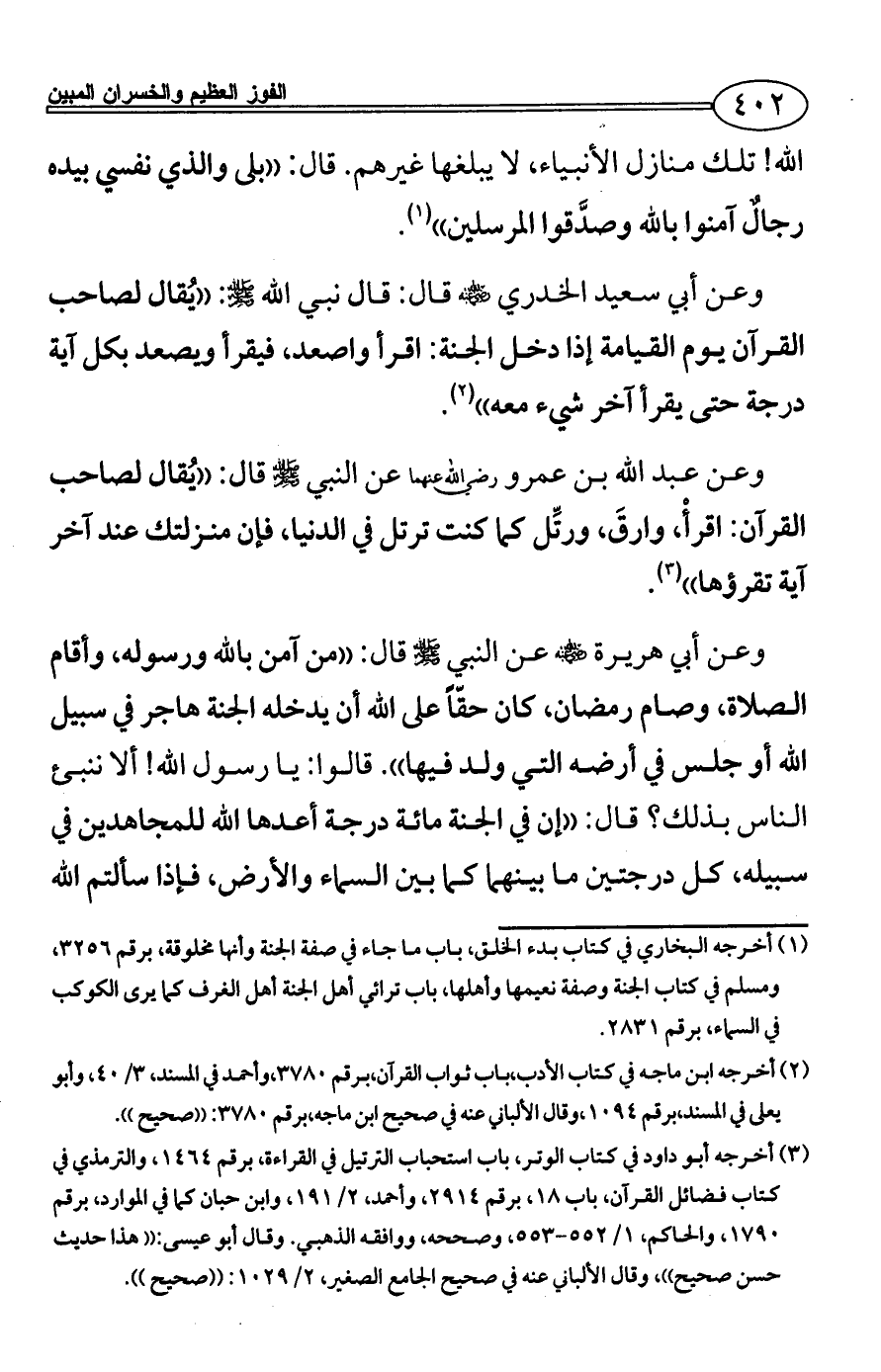 وعن أبي سعيد الخدري - رضي الله عنه - قال: قال نبي الله - صلى الله عليه وسلم -: ((يُقال لصاحب القرآن يوم القيامة إذا دخل الجنة: اقرأ واصعد، فيقرأ ويصعد بكل آية درجة حتى يقرأ آخر شيء معه)) (¬2).