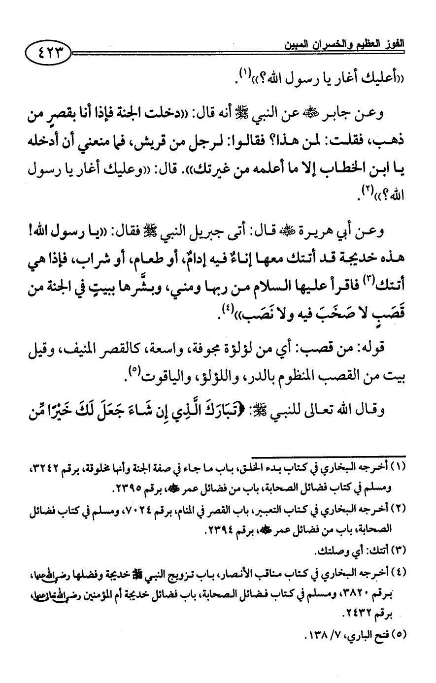 (¬1) أخرجه البخاري في كتاب بدء الخلق، باب ما جاء في صفة الجنة وأنها مخلوقة، برقم 3242، ومسلم في كتاب فضائل الصحابة، باب من فضائل عمر - رضي الله عنه -، برقم 2395.