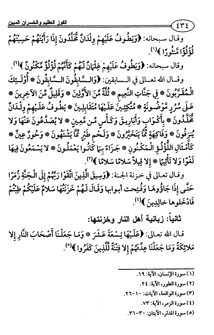 وقال الله تعالى في السابقين: {وَالسَّابِقُونَ السَّابِقُونَ * أُوْلَئِكَ الْمُقَرَّبُونَ * فِي جَنَّاتِ النَّعِيمِ * ثُلَّةٌ مِّنَ الأَوَّلِينَ * وَقَلِيلٌ مِّنَ الآخِرِينَ * عَلَى سُرُرٍ مَّوْضُونَةٍ * مُتَّكِئِينَ عَلَيْهَا مُتَقَابِلِينَ * يَطُوفُ عَلَيْهِمْ وِلْدَانٌ مُّخَلَّدُونَ * بِأَكْوَابٍ وَأَبَارِيقَ وَكَأْسٍ مِّن مَّعِينٍ * لا يُصَدَّعُونَ عَنْهَا وَلا يُنزِفُونَ * وَفَاكِهَةٍ مِّمَّا يَتَخَيَّرُونَ * وَلَحْمِ طَيْرٍ مِّمَّا يَشْتَهُونَ * وَحُورٌ عِينٌ * كَأَمْثَالِ اللُّؤْلُؤِ الْمَكْنُونِ * جَزَاءً بِمَا كَانُوا يَعْمَلُونَ * لا يَسْمَعُونَ فِيهَا لَغْوًا وَلا تَأْثِيمًا * إِلا قِيلاً سَلامًا سَلامًا} (¬5).