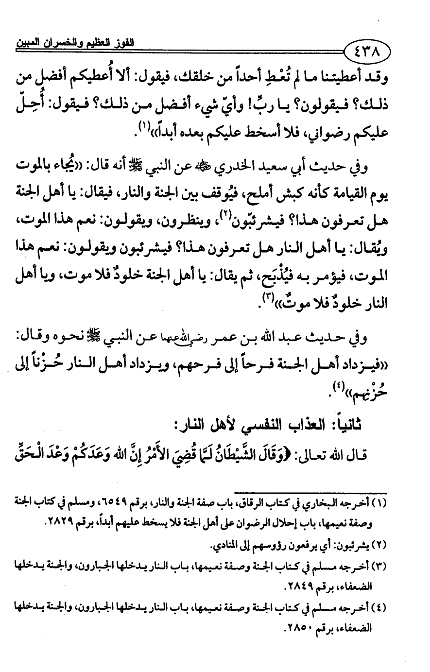 (¬1) أخرجه البخاري في كتاب الرقاق، باب صفة الجنة والنار، برقم 6549، ومسلم في كتاب الجنة وصفة نعيمها، باب إحلال الرضوان على أهل الجنة فلا يسخط عليهم أبداً، برقم 2829.