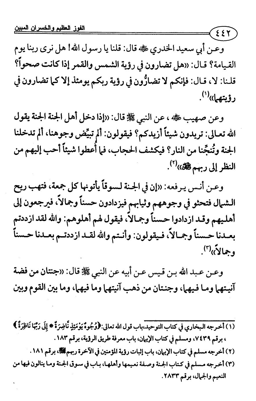 (¬2) أخرجه البخاري في كتاب التوحيد، باب قول الله تعالى: {وُجُوهٌ يَوْمَئِذٍ نَّاضِرَةٌ * إِلَى رَبِّهَا نَاظِرَةٌ}، برقم 7439، ومسلم في كتاب الإيمان، باب معرفة طريق الرؤية، برقم 183.