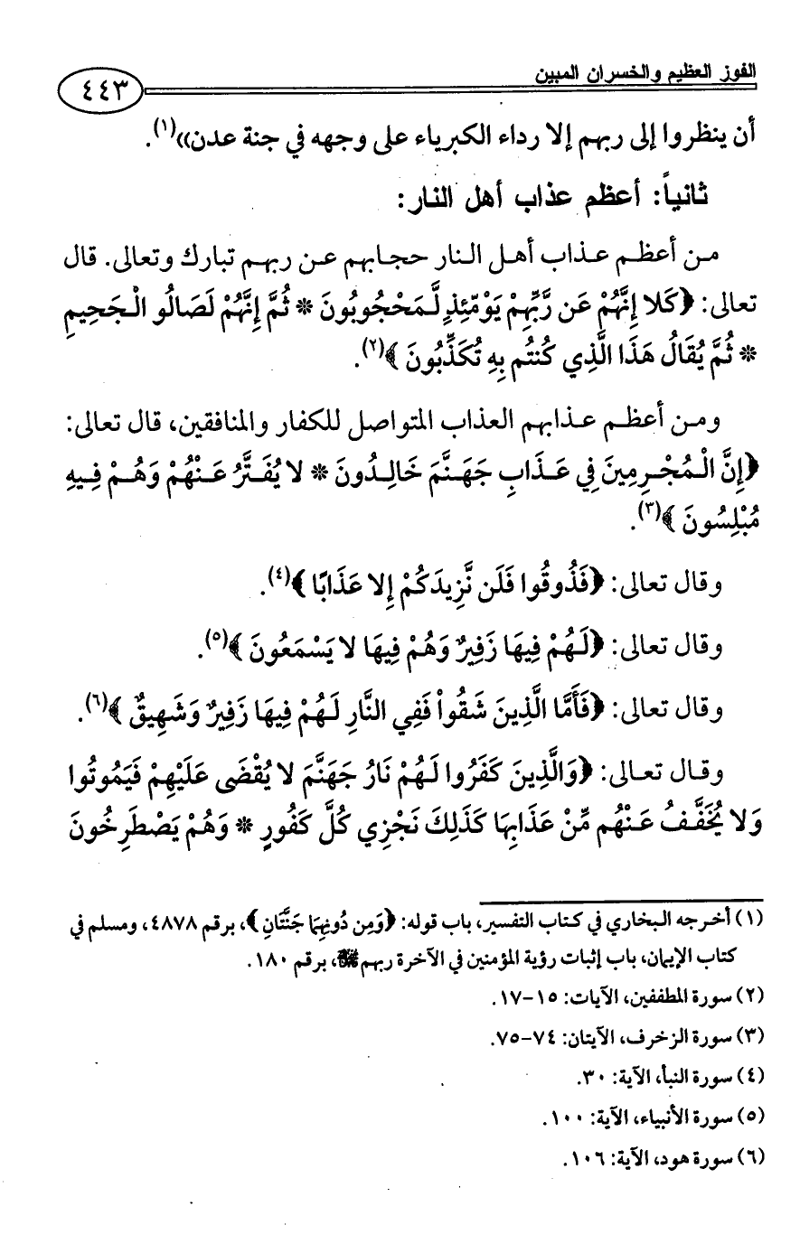 من أعظم عذاب أهل النار حجابهم عن ربهم تبارك وتعالى. قال تعالى: {كَلا إِنَّهُمْ عَن رَّبِّهِمْ يَوْمّئِذ لَّمَحْجُوبُونَ * ثُمَّ إِنَّهُمْ لَصَالُو الْجَحِيمِ * ثُمَّ يُقَالُ هَذَا الَّذِي كُنتُم بِهِ تُكَذِّبُونَ} (¬2).
