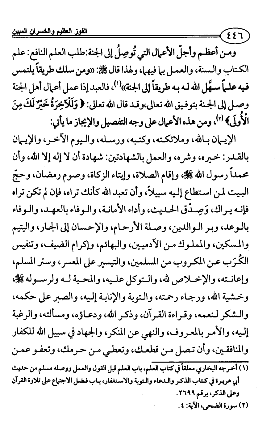 ومن أعظم وأجلّ الأعمال التي تُوصِلُ إلى الجنة: طلب العلم النافع: علم الكتاب والسنة، والعمل بما فيهما، ولهذا قال - صلى الله عليه وسلم -: ((ومن سلك طريقاً يلتمس فيه علماً سهَّل الله له به طريقاً إلى الجنة)) (¬2)، فالعبد إذا عمل أعمال أهل الجنة وصل إلى الجنة بتوفيق الله تعالى، وقد قال الله تعالى: {وَلَلْآخِرَةُ خَيْرٌ لَكَ مِنَ الْأُولَى} (¬3)، ومن هذه الأعمال على وجه التفصيل والإيجاز ما يأتي: