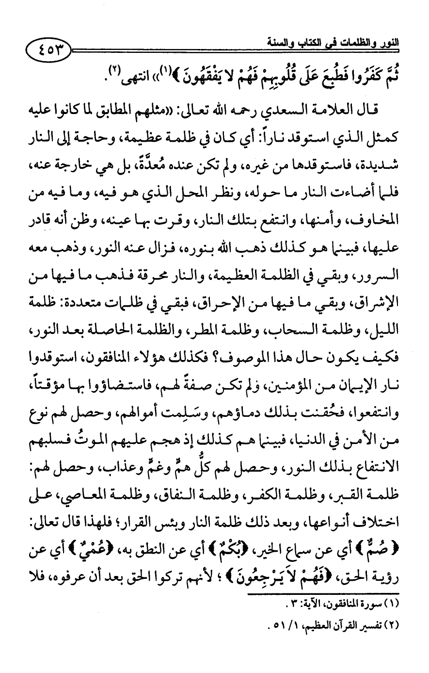 قال العلامة السعدي رحمه الله تعالى: ((مثلهم المطابق لما كانوا عليه كمثل الذي استوقد ناراً: أي كان في ظلمة عظيمة، وحاجة إلى النار شديدة، فاستوقدها من غيره، ولم تكن عنده مُعدَّةً، بل هي خارجة عنه، فلما أضاءت النار ما حوله، ونظر المحل الذي هو فيه، وما فيه من المخاوف، وأمنها، وانتفع بتلك النار، وقرت بها عينه، وظن أنه قادر عليها، فبينما هو كذلك ذهب الله بنوره، فزال عنه النور، وذهب معه السرور، وبقي في الظلمة العظيمة، والنار محرقة فذهب ما فيها من الإشراق، وبقي ما فيها من الإحراق، فبقي في ظلمات متعددة: ظلمة الليل، وظلمة السحاب، وظلمة المطر، والظلمة الحاصلة بعد النور، فكيف يكون حال هذا الموصوف؟ فكذلك هؤلاء المنافقون، استوقدوا نار الإيمان من المؤمنين، ولم تكن صفةً لهم، فاستضاؤوا بها مؤقتاً، وانتفعوا، فحُقنت بذلك دماؤهم، وسَلِمت أموالهم، وحصل لهم نوع من الأمن في الدنيا، فبينما هم كذلك إذ هجم عليهم الموتُ فسلبهم الانتفاع بذلك النور، وحصل لهم كلُّ همٍّ وغمٍّ وعذاب، وحصل لهم: ظلمة القبر، وظلمة الكفر، وظلمة النفاق، وظلمة المعاصي، على اختلاف أنواعها، وبعد ذلك ظلمة النار وبئس القرار؛ فلهذا قال تعالى: {صُمٌّ} أي عن سماع الخير، {بُكْمٌ} أي عن النطق به، {عُمْيٌ} أي عن رؤية الحق، {فَهُمْ لاَ يَرْجِعُونَ}؛ لأنهم تركوا الحق بعد أن عرفوه، فلا