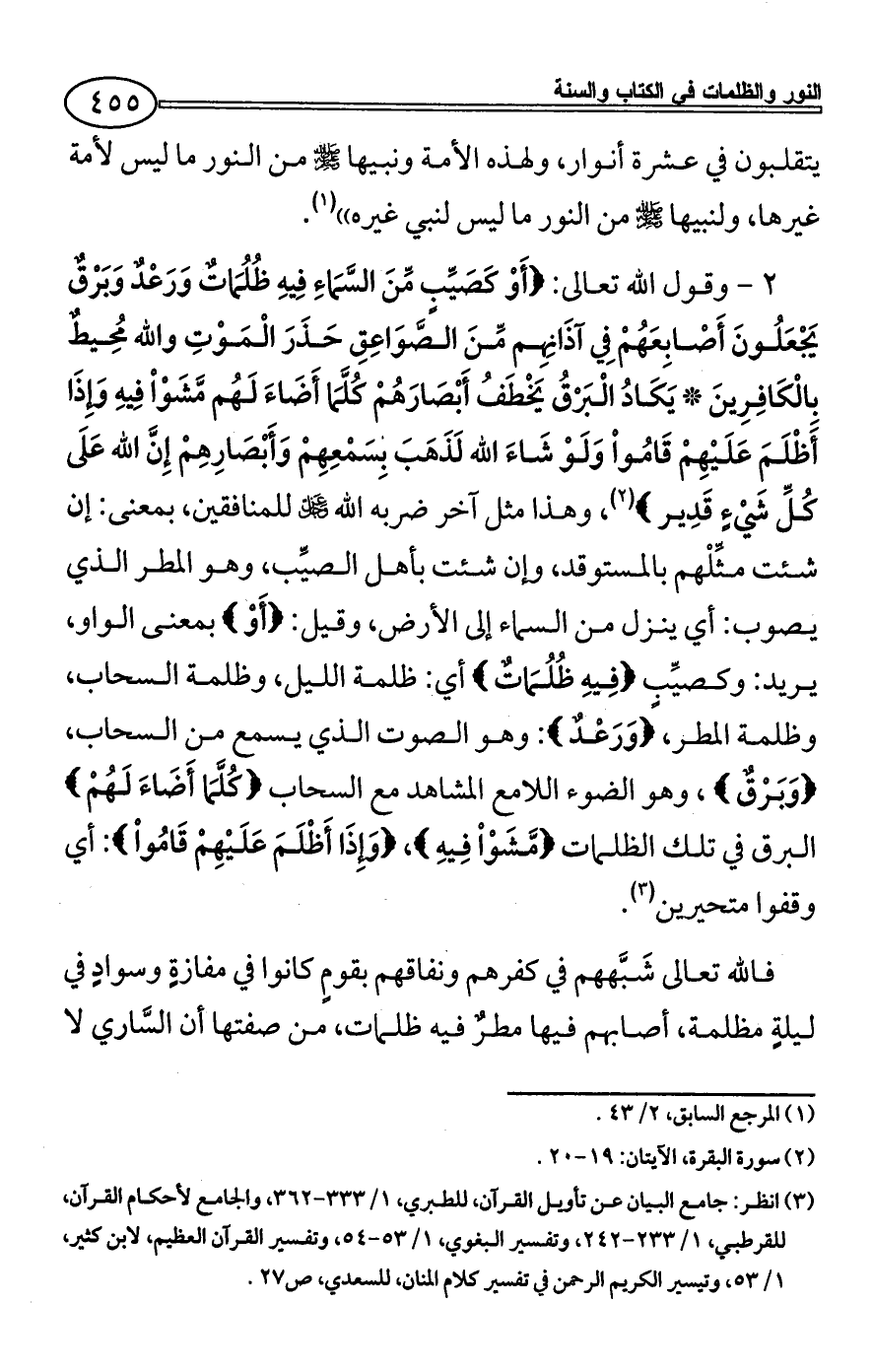 2 - وقول الله تعالى: {أَوْ كَصَيِّبٍ مِّنَ السَّمَاءِ فِيهِ ظُلُمَاتٌ وَرَعْدٌ وَبَرْقٌ يَجْعَلُونَ أَصْابِعَهُمْ فِي آذَانِهِم مِّنَ الصَّوَاعِقِ حَذَرَ الْمَوْتِ والله مُحِيطٌ بِالْكَافِرِينَ * يَكَادُ الْبَرْقُ يَخْطَفُ أَبْصَارَهُمْ كُلَّمَا أَضَاءَ لَهُم مَّشَوْاْ فِيهِ وَإِذَا أَظْلَمَ عَلَيْهِمْ قَامُواْ وَلَوْ شَاءَ الله لَذَهَبَ بِسَمْعِهِمْ وَأَبْصَارِهِمْ إِنَّ الله عَلَى كُلِّ شَيْءٍ قَدِير} (¬2)، وهذا مثل آخر ضربه الله - عز وجل - للمنافقين، بمعنى: إن شئت مثِّلْهم بالمستوقد، وإن شئت بأهل الصيِّب، وهو المطر الذي يصوب: أي ينزل من السماء إلى الأرض، وقيل: {أَوْ} بمعنى الواو، يريد: وكصيِّبٍ {فِيهِ ظُلُمَاتٌ} أي: ظلمة الليل، وظلمة السحاب، وظلمة المطر، {وَرَعْدٌ}: وهو الصوت الذي يسمع من السحاب،