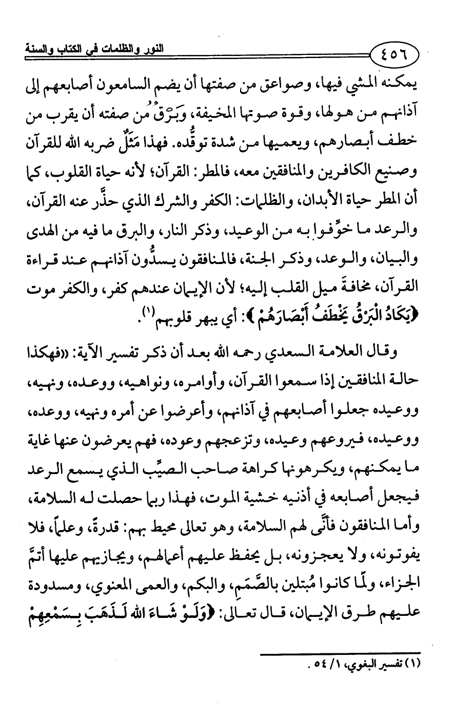 يمكنه المشي فيها، وصواعق من صفتها أن يضم السامعون أصابعهم إلى آذانهم من هولها، وقوة صوتها المخيفة، وبرق من صفته أن يقرب من خطف أبصارهم، ويعميها من شدة توقُّده. فهذا مَثَلٌ ضربه الله للقرآن وصنيع الكافرين والمنافقين معه، فالمطر: القرآن؛ لأنه حياة القلوب، كما أن المطر حياة الأبدان، والظلمات: الكفر والشرك الذي حذَّر عنه القرآن، والرعد ما خوِّفوا به من الوعيد، وذكر النار، والبرق ما فيه من الهدى والبيان، والوعد، وذكر الجنة، فالمنافقون يسدُّون آذانهم عند قراءة القرآن، مخافةَ ميل القلب إليه؛ لأن الإيمان عندهم كفر، والكفر موت