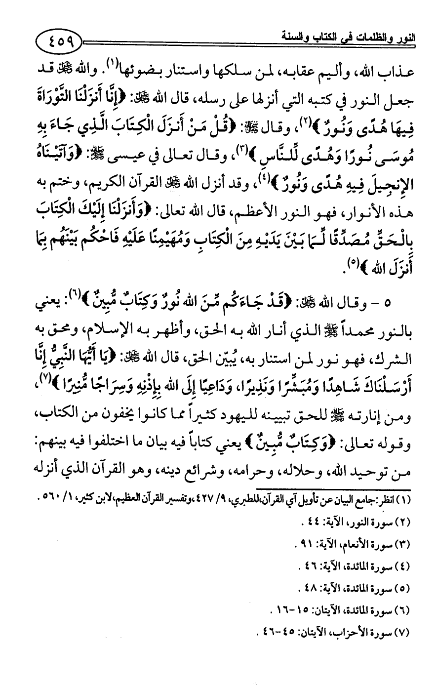 عذاب الله، وأليم عقابه، لمن سلكها واستنار بضوئها (¬1). والله - عز وجل - قد جعل النور في كتبه التي أنزلها على رسله، قال الله - عز وجل -: {إِنَّا أَنزَلْنَا التَّوْرَاةَ فِيهَا هُدًى وَنُورٌ} (¬2)، وقال - سبحانه وتعالى -: {قُلْ مَنْ أَنزَلَ الْكِتَابَ الَّذِي جَاءَ بِهِ مُوسَى نُورًا وَهُدًى لِّلنَّاسِ} (¬3)، وقال تعالى في عيسى - صلى الله عليه وسلم -: {وَآتَيْنَاهُ الإِنجِيلَ فِيهِ هُدًى وَنُورٌ} (¬4)، وقد أنزل الله - عز وجل - القرآن الكريم، وختم به هذه الأنوار، فهو النور الأعظم، قال الله تعالى: {وَأَنزَلْنَا إِلَيْكَ الْكِتَابَ بِالْحَقِّ مُصَدِّقًا لِّمَا بَيْنَ يَدَيْهِ مِنَ الْكِتَابِ وَمُهَيْمِنًا عَلَيْهِ فَاحْكُم بَيْنَهُم بِمَا أَنزَلَ الله} (¬5).