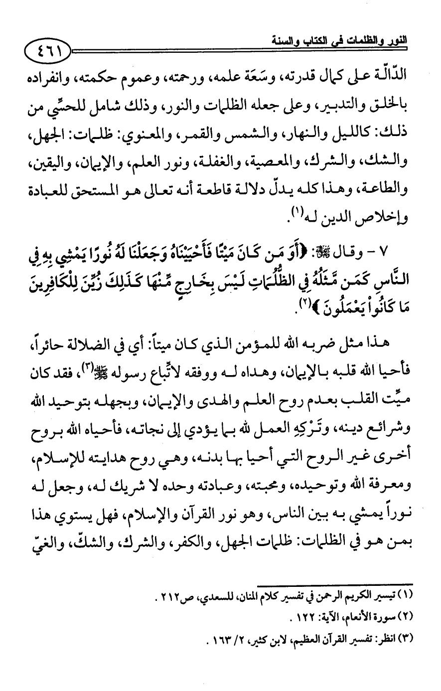 7 - وقال - سبحانه وتعالى -: {أَوَ مَن كَانَ مَيْتًا فَأَحْيَيْنَاهُ وَجَعَلْنَا لَهُ نُورًا يَمْشِي بِهِ فِي النَّاسِ كَمَن مَّثَلُهُ فِي الظُّلُمَاتِ لَيْسَ بِخَارِجٍ مِّنْهَا كَذَلِكَ زُيِّنَ لِلْكَافِرِينَ