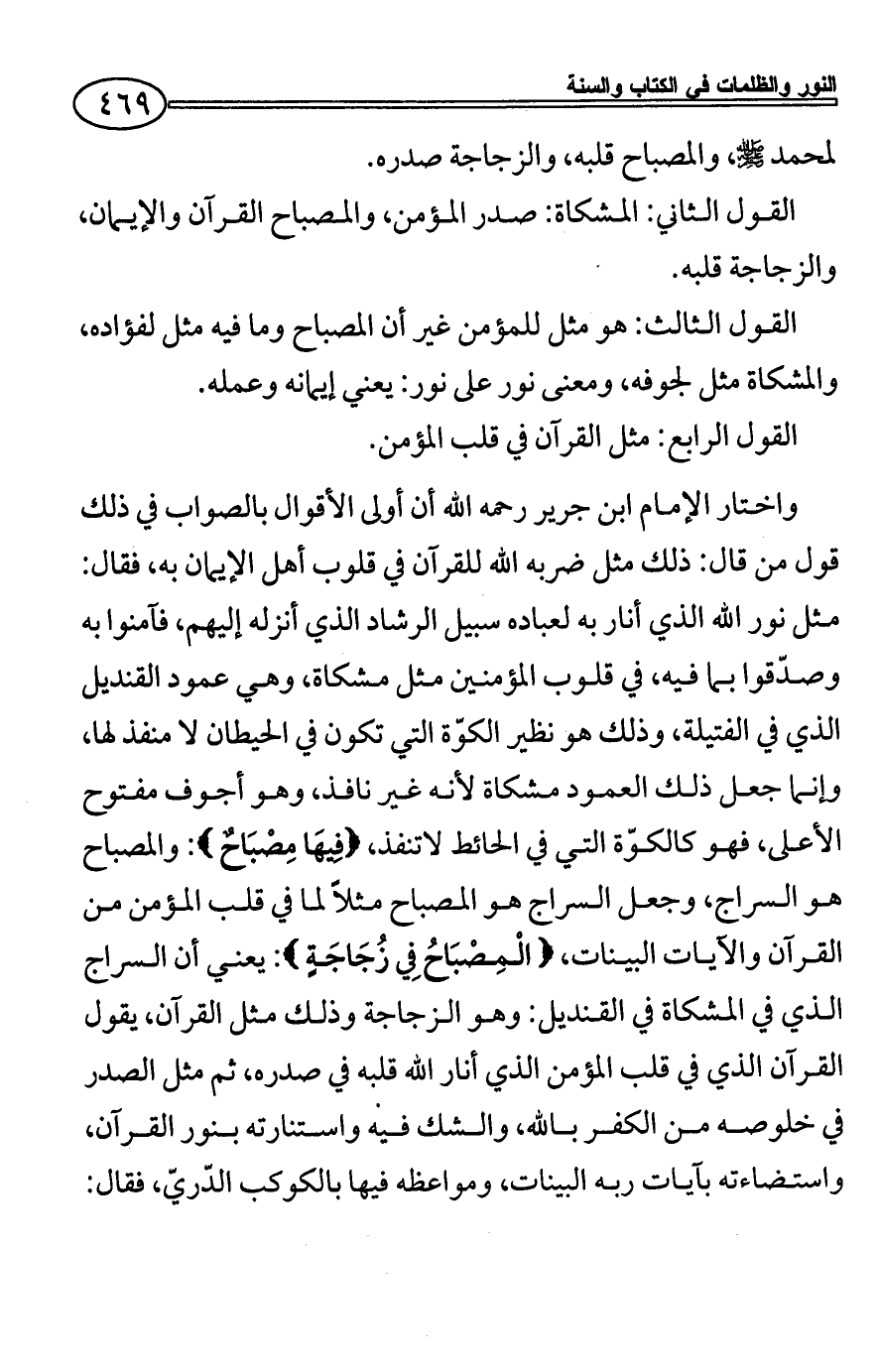 واختار الإمام ابن جرير رحمه الله أن أولى الأقوال بالصواب في ذلك قول من قال: ذلك مثل ضربه الله للقرآن في قلوب أهل الإيمان به، فقال: مثل نور الله الذي أنار به لعباده سبيل الرشاد الذي أنزله إليهم، فآمنوا به وصدّقوا بما فيه، في قلوب المؤمنين مثل مشكاة، وهي عمود القنديل الذي في الفتيلة، وذلك هو نظير الكوّة التي تكون في الحيطان لا منفذ لها، وإنما جعل ذلك العمود مشكاة لأنه غير نافذ، وهو أجوف مفتوح الأعلى، فهو كالكوّة التي في الحائط لاتنفذ، {فِيهَا مِصْبَاحٌ}: والمصباح هو السراج، وجعل السراج هو المصباح مثلاً لما في قلب المؤمن من القرآن والآيات البينات، {الْمِصْبَاحُ فِي زُجَاجَةٍ}: يعني أن السراج الذي في المشكاة في القنديل: وهو الزجاجة وذلك مثل القرآن، يقول القرآن الذي في قلب المؤمن الذي أنار الله قلبه في صدره، ثم مثل الصدر في خلوصه من الكفر بالله، والشك فيه واستنارته بنور القرآن، واستضاءته بآيات ربه البينات، ومواعظه فيها بالكوكب الدّريّ، فقال:
