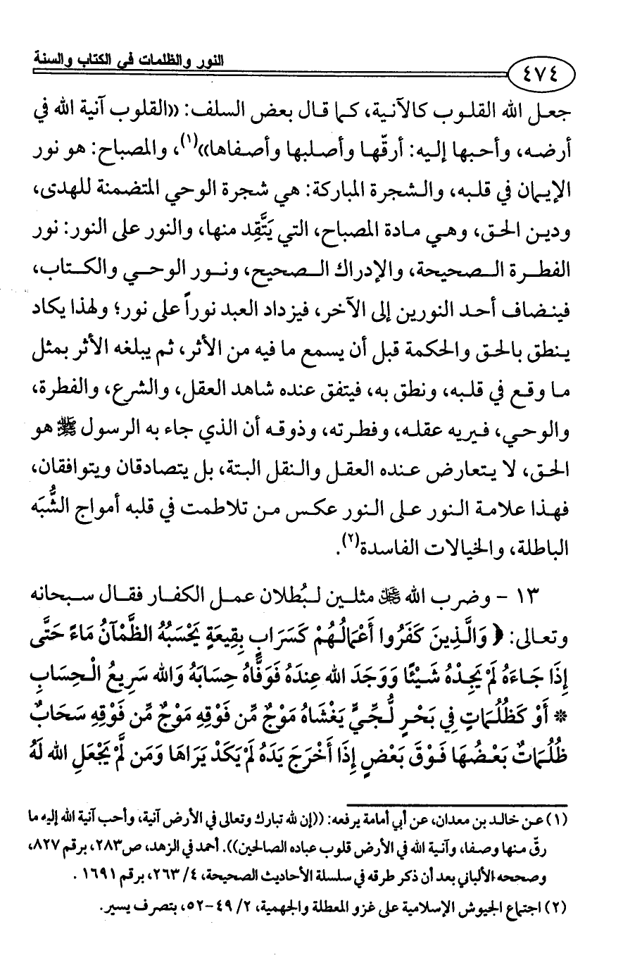 13 - وضرب الله - عز وجل - مثلين لبُطلان عمل الكفار فقال سبحانه وتعالى: {وَالَّذِينَ كَفَرُوا أَعْمَالُهُمْ كَسَرَابٍ بِقِيعَةٍ يَحْسَبُهُ الظَّمْآنُ مَاءً حَتَّى إِذَا جَاءَهُ لَمْ يَجِدْهُ شَيْئًا وَوَجَدَ الله عِندَهُ فَوَفَّاهُ حِسَابَهُ وَالله سَرِيعُ الْحِسَابِ * أَوْ كَظُلُمَاتٍ فِي بَحْرٍ لُّجِّيٍّ يَغْشَاهُ مَوْجٌ مِّن فَوْقِهِ مَوْجٌ مِّن فَوْقِهِ سَحَابٌ ظُلُمَاتٌ بَعْضُهَا فَوْقَ بَعْضٍ إِذَا أَخْرَجَ يَدَهُ لَمْ يَكَدْ يَرَاهَا وَمَن لَّمْ يَجْعَلِ الله لَهُ