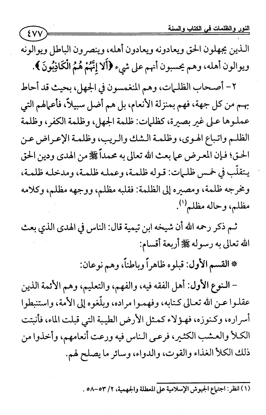 2 - أصحاب الظلمات، وهم المنغمسون في الجهل، بحيث قد أحاط بهم من كل جهة، فهم بمنزلة الأنعام، بل هم أضل سبيلاً، فأعمالهم التي عملوها على غير بصيرة، كظلمات: ظلمة الجهل، وظلمة الكفر، وظلمة الظلم واتباع الهوى، وظلمة الشك والريب، وظلمة الإعراض عن الحق؛ فإن المعرض عما بعث الله تعالى به محمداً - صلى الله عليه وسلم - من الهدى ودين الحق يتقلّب في خمس ظلمات: قوله ظلمة، وعمله ظلمة، ومدخله ظلمة، ومخرجه ظلمة، ومصيره إلى الظلمة: فقلبه مظلم، ووجهه مظلم، وكلامه مظلم، وحاله مظلم (¬1).