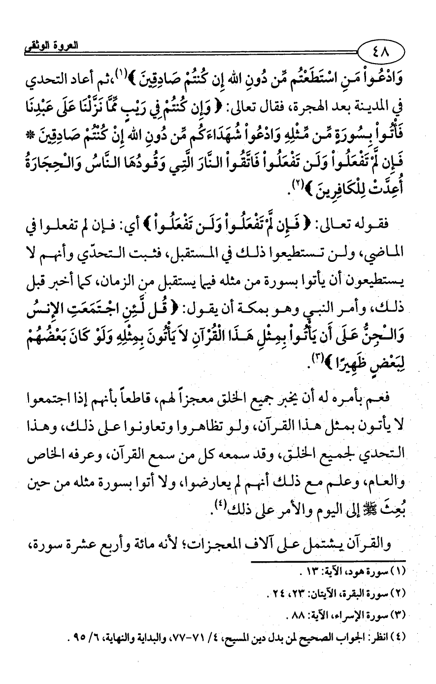 في المدينة بعد الهجرة، فقال تعالى: {وَإِن كُنتُمْ فِي رَيْبٍ مِّمَّا نَزَّلْنَا عَلَى عَبْدِنَا فَأْتُواْ بِسُورَةٍ مِّن مِّثْلِهِ وَادْعُواْ شُهَدَاءَكُم مِّن دُونِ الله إِنْ كُنْتُمْ صَادِقِينَ * فَإِن لَّمْ تَفْعَلُواْ وَلَن تَفْعَلُواْ فَاتَّقُواْ النَّارَ الَّتِي وَقُودُهَا النَّاسُ وَالْحِجَارَةُ أُعِدَّتْ لِلْكَافِرِينَ} (¬1).