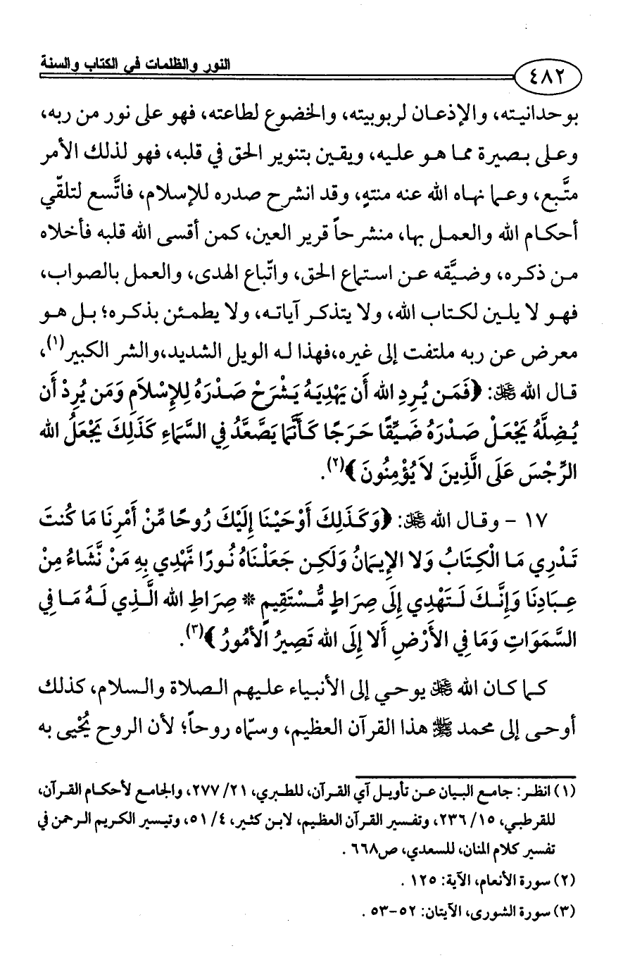 17 - وقال الله - عز وجل -: {وَكَذَلِكَ أَوْحَيْنَا إِلَيْكَ رُوحًا مِّنْ أَمْرِنَا مَا كُنتَ تَدْرِي مَا الْكِتَابُ وَلا الإِيمَانُ وَلَكِن جَعَلْنَاهُ نُورًا نَّهْدِي بِهِ مَنْ نَّشَاءُ مِنْ عِبَادِنَا وَإِنَّكَ لَتَهْدِي إِلَى صِرَاطٍ مُّسْتَقِيمٍ * صِرَاطِ الله الَّذِي لَهُ مَا فِي السَّمَوَاتِ وَمَا فِي الأَرْضِ أَلا إِلَى الله تَصِيرُ الأمُورُ} (¬3).