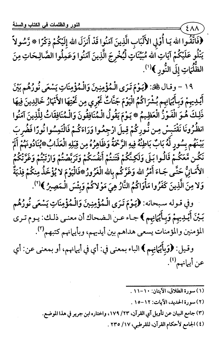 19 - وقال - عز وجل -: {يَوْمَ تَرَى الْمُؤْمِنِينَ وَالْمُؤْمِنَاتِ يَسْعَى نُورُهُم بَيْنَ أَيْدِيهِمْ وَبِأَيْمَانِهِم بُشْرَاكُمُ الْيَوْمَ جَنَّاتٌ تَجْرِي مِن تَحْتِهَا الأَنْهَارُ خَالِدِينَ فِيهَا ذَلِكَ هُوَ الْفَوْزُ الْعَظِيمُ * يَوْمَ يَقُولُ الْمُنَافِقُونَ وَالْمُنَافِقَاتُ لِلَّذِينَ آمَنُوا انظُرُونَا نَقْتَبِسْ مِن نُّورِكُمْ قِيلَ ارْجِعُوا وَرَاءَكُمْ فَالْتَمِسُوا نُورًا فَضُرِبَ بَيْنَهُم بِسُورٍ لَّهُ بَابٌ بَاطِنُهُ فِيهِ الرَّحْمَةُ وَظَاهِرُهُ مِن قِبَلِهِ الْعَذَابُ*يُنَادُونَهُمْ أَلَمْ نَكُن مَّعَكُمْ قَالُوا بَلَى وَلَكِنَّكُمْ فَتَنتُمْ أَنفُسَكُمْ وَتَرَبَّصْتُمْ وَارْتَبْتُمْ وَغَرَّتْكُمُ الأَمَانِيُّ حَتَّى جَاءَ أَمْرُ الله وَغَرَّكُم بِالله الْغَرُورُ*فَالْيَوْمَ لا يُؤْخَذُ مِنكُمْ فِدْيَةٌ وَلا مِنَ الَّذِينَ كَفَرُوا مَأْوَاكُمُ النَّارُ هِيَ مَوْلاكُمْ وَبِئْسَ الْمَصِيرُ} (¬2).