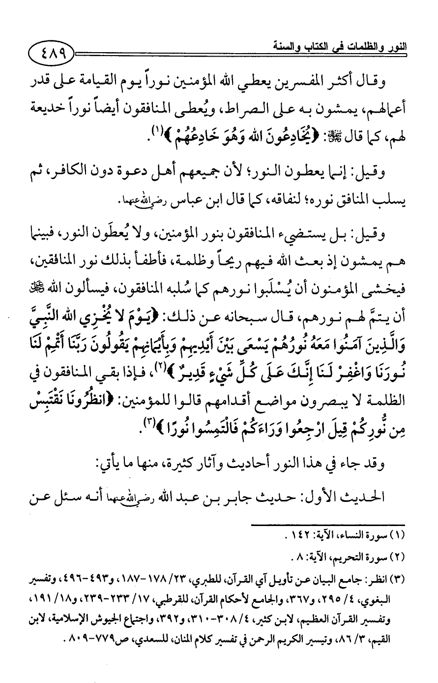وقال أكثر المفسرين يعطي الله المؤمنين نوراً يوم القيامة على قدر أعمالهم، يمشون به على الصراط، ويُعطى المنافقون أيضاً نوراً خديعة لهم، كما قال - سبحانه وتعالى -: {يُخَادِعُونَ الله وَهُوَ خَادِعُهُمْ} (¬1).