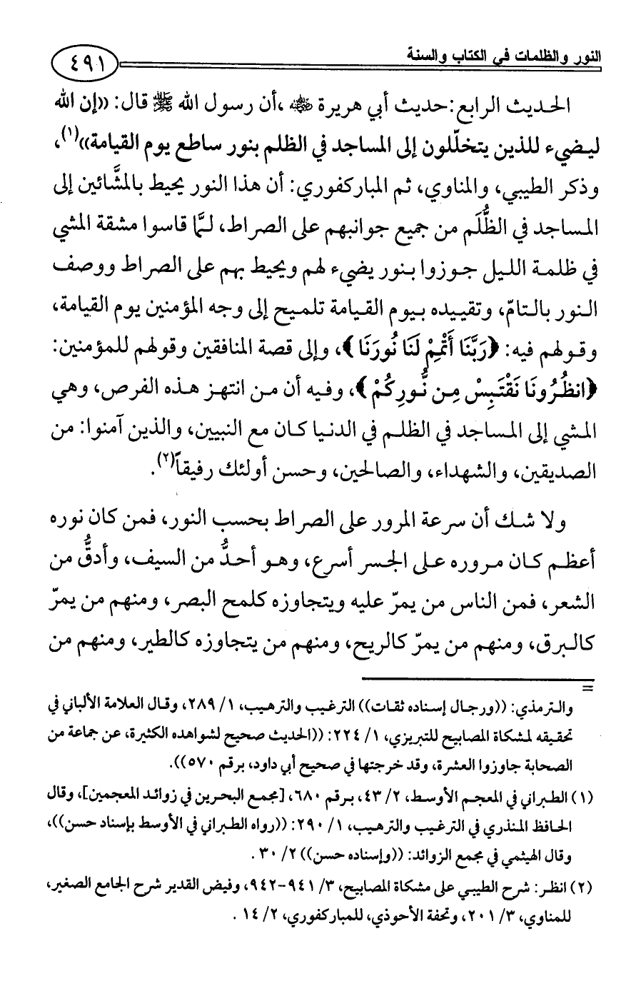 الحديث الرابع: حديث أبي هريرة - رضي الله عنه -،أن رسول الله - صلى الله عليه وسلم - قال: ((إن الله ليضيء للذين يتخلّلون إلى المساجد في الظلم بنور ساطع يوم القيامة)) (¬1)، وذكر الطيبي، والمناوي، ثم المباركفوري: أن هذا النور يحيط بالمشَّائين إلى المساجد في الظُّلَم من جميع جوانبهم على الصراط، لمَّا قاسوا مشقة المشي في ظلمة الليل جوزوا بنور يضيء لهم ويحيط بهم على الصراط ووصف النور بالتامّ، وتقييده بيوم القيامة تلميح إلى وجه المؤمنين يوم القيامة، وقولهم فيه: {رَبَّنَا أَتْمِمْ لَنَا نُورَنَا}، وإلى قصة المنافقين وقولهم للمؤمنين: {انظُرُونَا نَقْتَبِسْ مِن نُّورِكُمْ}، وفيه أن من انتهز هذه الفرص، وهي المشي إلى المساجد في الظلم في الدنيا كان مع النبيين، والذين آمنوا: من الصديقين، والشهداء، والصالحين، وحسن أولئك رفيقاً (¬2).