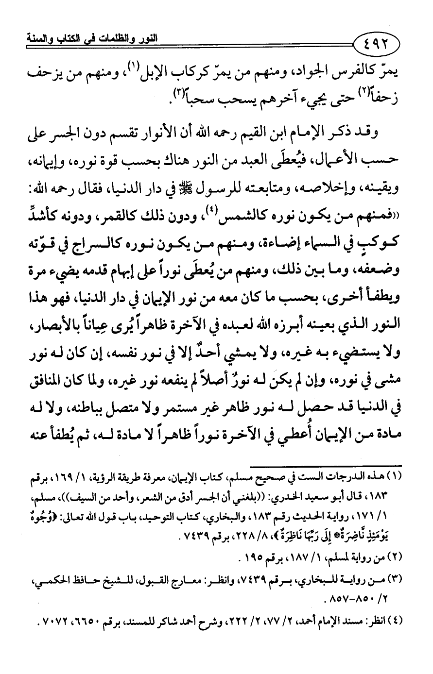 وقد ذكر الإمام ابن القيم رحمه الله أن الأنوار تقسم دون الجسر على حسب الأعمال، فيُعطَى العبد من النور هناك بحسب قوة نوره، وإيمانه، ويقينه، وإخلاصه، ومتابعته للرسول - صلى الله عليه وسلم - في دار الدنيا، فقال رحمه الله: ((فمنهم من يكون نوره كالشمس (¬4)، ودون ذلك كالقمر، ودونه كأشدِّ كوكبٍ في السماء إضاءة، ومنهم من يكون نوره كالسراج في قوّته وضعفه، وما بين ذلك، ومنهم من يُعطَى نوراً على إبهام قدمه يضيء مرة ويطفأ أخرى، بحسب ما كان معه من نور الإيمان في دار الدنيا، فهو هذا النور الذي بعينه أبرزه الله لعبده في الآخرة ظاهراً يُرى عِياناً بالأبصار، ولا يستضيء به غيره، ولا يمشي أحدٌ إلا في نور نفسه، إن كان له نور مشى في نوره، وإن لم يكن له نورٌ أصلاً لم ينفعه نور غيره، ولما كان المنافق في الدنيا قد حصل له نور ظاهر غير مستمر ولا متصل بباطنه، ولا له مادة من الإيمان أُعطي في الآخرة نوراً ظاهراً لا مادة له، ثم يُطفأ عنه