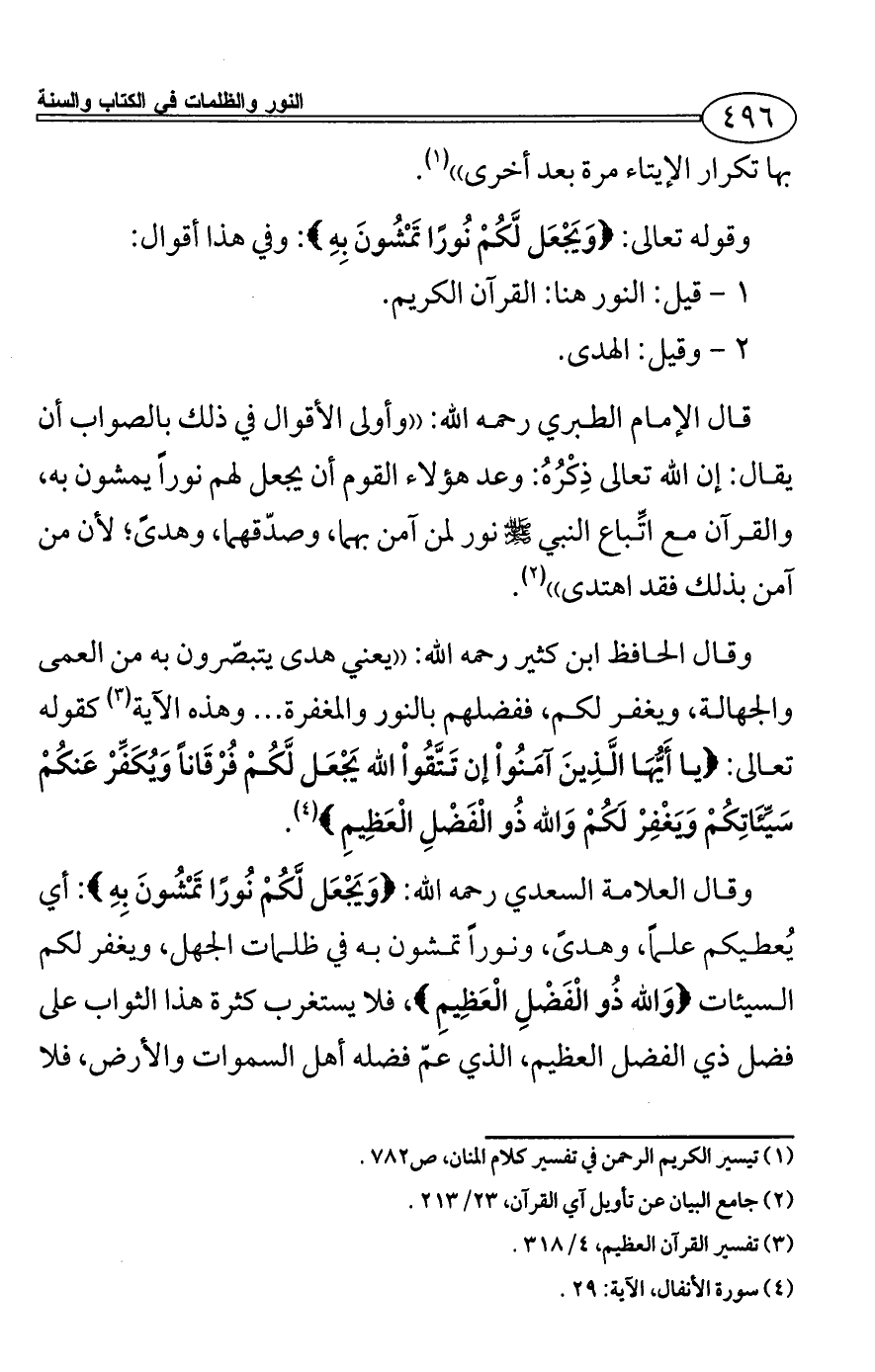 قال الإمام الطبري رحمه الله: ((وأولى الأقوال في ذلك بالصواب أن يقال: إن الله تعالى ذِكْرُهُ: وعد هؤلاء القوم أن يجعل لهم نوراً يمشون به، والقرآن مع اتِّباع النبي - صلى الله عليه وسلم - نور لمن آمن بهما، وصدّقهما، وهدىً؛ لأن من آمن بذلك فقد اهتدى)) (¬2).