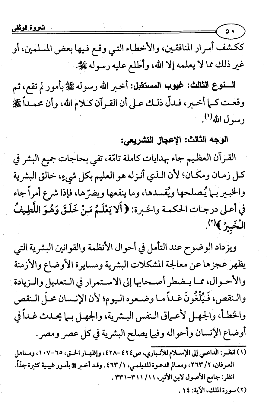 (¬1) انظر: الداعي إلى الإسلام للأنباري، ص424 - 428، وإظهار الحق، 65 - 107، ومناهل العرفان، 2/ 263، ومعالم الدعوة للديلمي، 1/ 463. وقد أخبر - صلى الله عليه وسلم - بأمور غيبية كثيرة جدّاً. انظر: جامع الأصول لابن الأثير، 11/ 311 - 331.