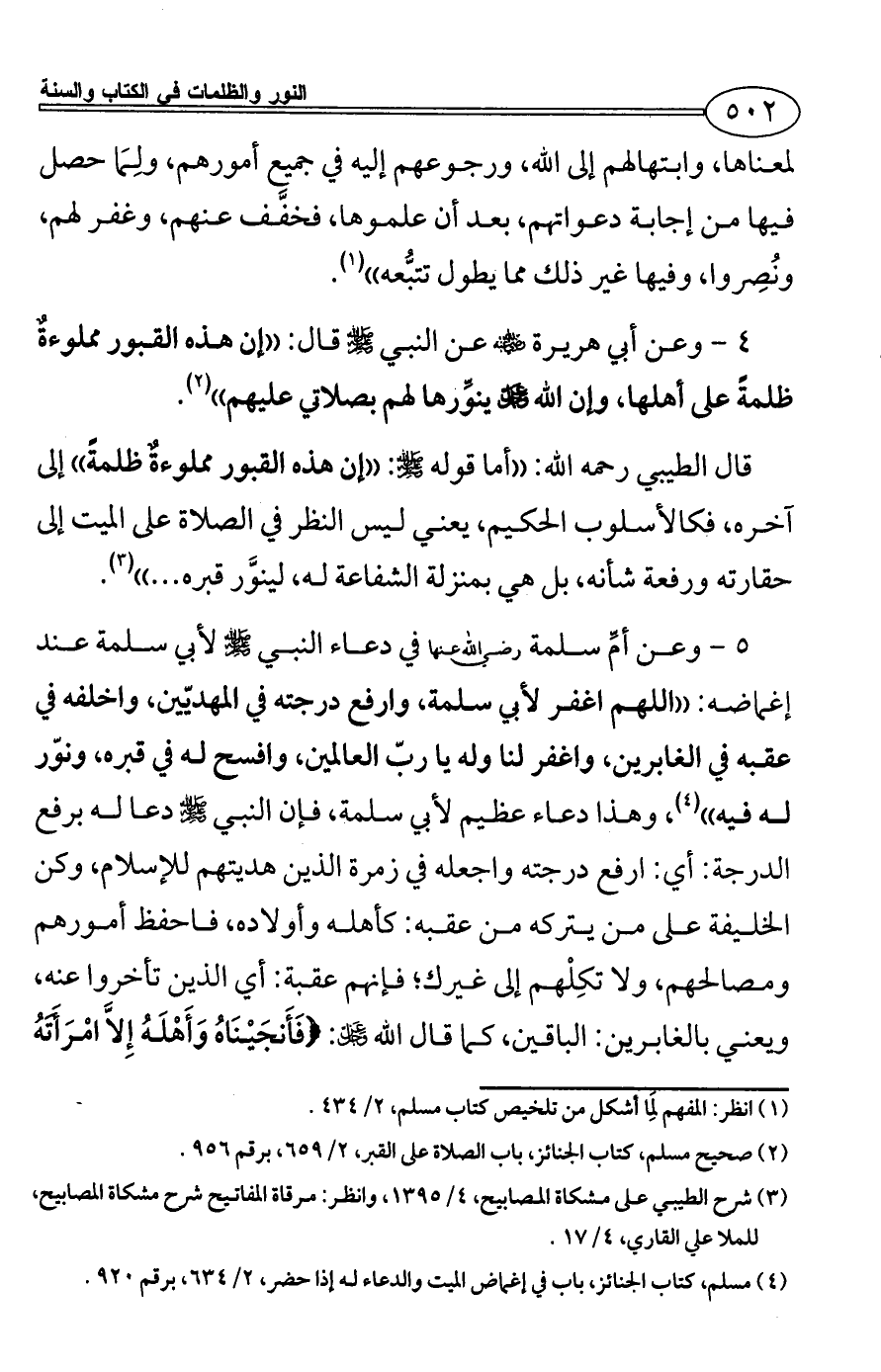 4 - وعن أبي هريرة - رضي الله عنه - عن النبي - صلى الله عليه وسلم - قال: ((إن هذه القبور مملوءةٌ ظلمةً على أهلها، وإن الله - عز وجل - ينوِّرها لهم بصلاتي عليهم)) (¬2).