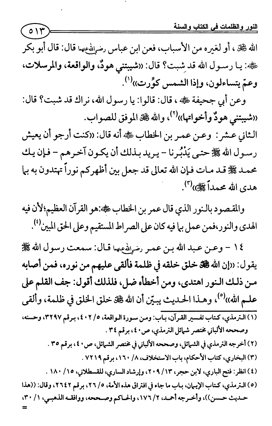 والمقصود بالنور الذي قال عمر بن الخطاب - رضي الله عنه -:هو القرآن العظيم؛ لأن فيه الهدى والنور، فمن عمل بما فيه كان على الصراط المستقيم وعلى الحق المبين (¬4).