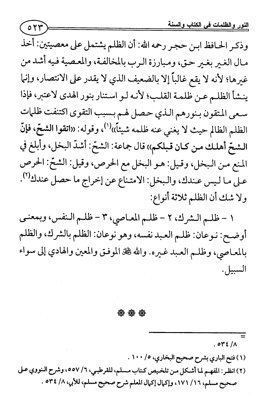 وذكر الحافظ ابن حجر رحمه الله: أن الظلم يشتمل على معصيتين: أخذ مال الغير بغير حق، ومبارزة الرب بالمخالفة، والمعصية فيه أشد من غيرها؛ لأنه لا يقع غالباً إلا بالضعيف الذي لا يقدر على الانتصار، وإنما ينشأ الظلم عن ظلمة القلب؛ لأنه لو استنار بنور الهدى لاعتبر، فإذا سعى المتقون بنورهم الذي حصل لهم بسبب التقوى اكتنفت ظلمات الظلم الظالم حيث لا يغني عنه ظلمه شيئاً)) (¬1)، وقوله: ((اتقوا الشحّ، فإنّ الشحّ أهلك من كان قبلكم)) قال جماعة: الشحّ: أشدّ البخل، وأبلغ في المنع من البخل، وقيل: هو البخل مع الحرص، وقيل: الشحّ: الحرص على ما ليس عندك، والبخل: الامتناع عن إخراج ما حصل عندك (¬2). ولا شك أن الظلم ثلاثة أنواع: