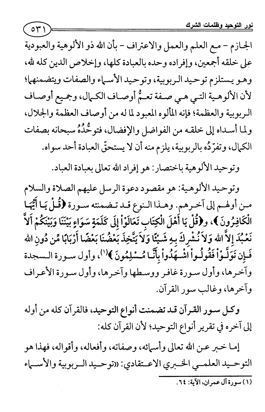 الجازم - مع العلم والعمل والاعتراف - بأن الله ذو الألوهية والعبودية على خلقه أجمعين، وإفراده وحده بالعبادة كلها، وإخلاص الدين كله لله، وهو يستلزم توحيد الربوبية، وتوحيد الأسماء والصفات ويتضمنهما؛ لأن الألوهية التي هي صفة تعمُّ أوصاف الكمال، وجميع أوصاف الربوبية والعظمة؛ فإنه المألوه المعبود لما له من أوصاف العظمة والجلال، ولما أسداه إلى خلقه من الفواضل والإفضال، فتوحُّدُهُ سبحانه بصفات الكمال، وتفرّدُه بالربوبية، يلزم منه أن لا يستحقّ العبادة أحد سواه.