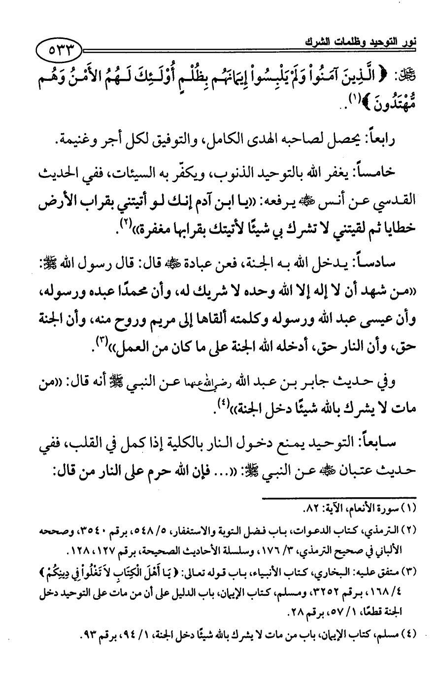 (¬4) مسلم، كتاب الإيمان، باب من مات لا يشرك بالله شيئًا دخل الجنة، 1/ 94، برقم 93.