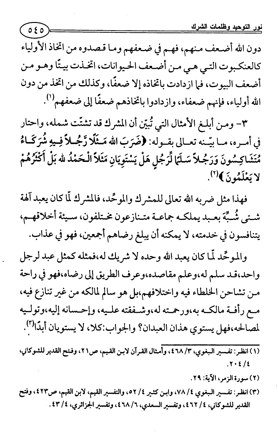 3 - ومن أبلغ الأمثال التي تُبيّن أن المشرك قد تشتّت شمله، واحتار في أمره، ما بيّنه تعالى بقوله: {ضَرَبَ الله مَثَلًا رَّجُلاً فِيهِ شُرَكَاءُ مُتَشَاكِسُونَ وَرَجُلاً سَلَمًا لِّرَجُلٍ هَلْ يَسْتَوِيَانِ مَثَلاً الْحَمْدُ لله بَلْ أَكْثَرُهُمْ لا يَعْلَمُونَ} (¬2).