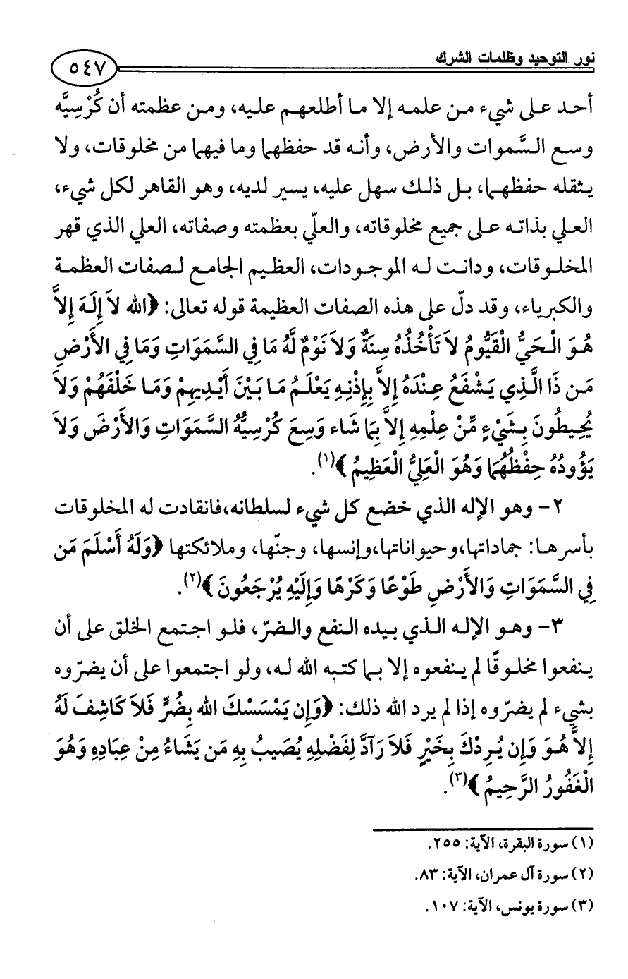 يثقله حفظهما، بل ذلك سهل عليه، يسير لديه، وهو القاهر لكل شيء، العلي بذاته على جميع مخلوقاته، والعلّي بعظمته وصفاته، العلي الذي قهر المخلوقات، ودانت له الموجودات، العظيم الجامع لصفات العظمة والكبرياء، وقد دلّ على هذه الصفات العظيمة قوله تعالى: {الله لاَ إِلَهَ إِلاَّ هُوَ الْحَيُّ الْقَيُّومُ لاَ تَأْخُذُهُ سِنَةٌ وَلاَ نَوْمٌ لَّهُ مَا فِي السَّمَوَاتِ وَمَا فِي الأَرْضِ مَن ذَا الَّذِي يَشْفَعُ عِنْدَهُ إِلاَّ بِإِذْنِه يَعْلَمُ مَا بَيْنَ أَيْدِيهِمْ وَمَا خَلْفَهُمْ وَلاَ يُحِيطُونَ بِشَيْءٍ مِّنْ عِلْمِهِ إِلاَّ بِمَا شَاء وَسِعَ كُرْسِيُّهُ السَّمَوَاتِ وَالأَرْضَ وَلاَ يَؤُودُهُ حِفْظُهُمَا وَهُوَ الْعَلِيُّ الْعَظِيمُ} (¬1).