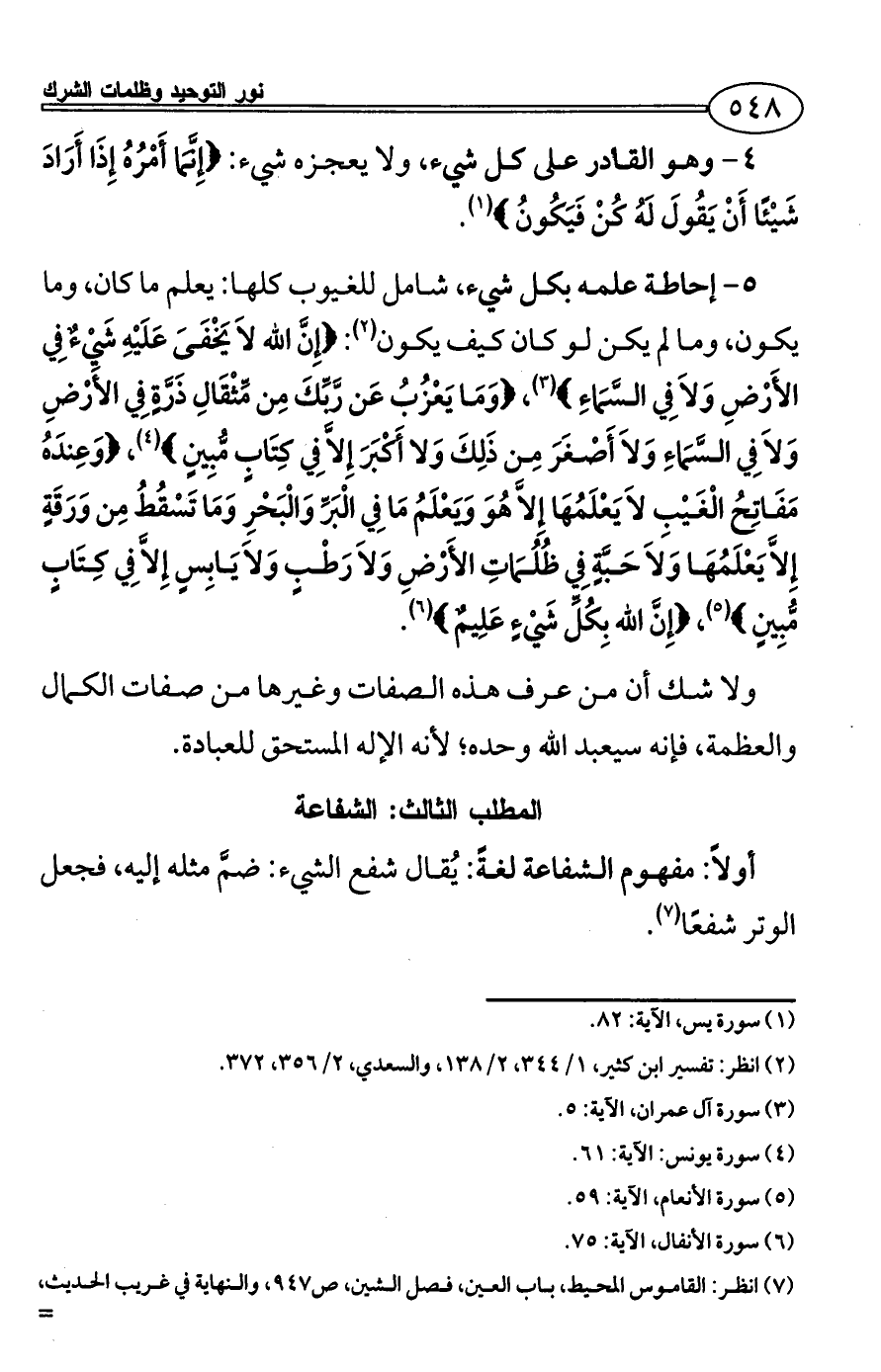 5 - إحاطة علمه بكل شيء، شامل للغيوب كلها: يعلم ما كان، وما يكون، وما لم يكن لو كان كيف يكون (¬2): {إِنَّ الله لاَ يَخْفَىَ عَلَيْهِ شَيْءٌ فِي الأَرْضِ وَلاَ فِي السَّمَاءِ} (¬3)، {وَمَا يَعْزُبُ عَن رَّبِّكَ مِن مِّثْقَالِ ذَرَّةٍ فِي الأَرْضِ وَلاَ فِي السَّمَاءِ وَلاَ أَصْغَرَ مِن ذَلِكَ وَلا أَكْبَرَ إِلاَّ فِي كِتَابٍ مُّبِينٍ} (¬4)، {وَعِندَهُ مَفَاتِحُ الْغَيْبِ لاَ يَعْلَمُهَا إِلاَّ هُوَ وَيَعْلَمُ مَا فِي الْبَرِّ وَالْبَحْرِ وَمَا تَسْقُطُ مِن وَرَقَةٍ إِلاَّ يَعْلَمُهَا وَلاَ حَبَّةٍ فِي ظُلُمَاتِ الأَرْضِ وَلاَ رَطْبٍ وَلاَ يَابِسٍ إِلاَّ فِي كِتَابٍ مُّبِينٍ} (¬5)، {إِنَّ الله بِكُلِّ شَيْءٍ عَلِيمٌ} (¬6).