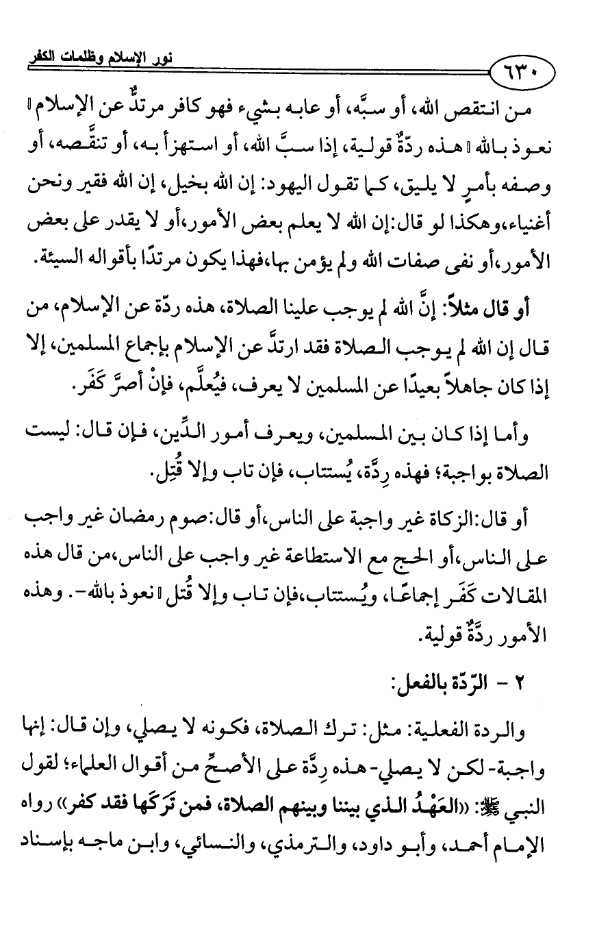 والردة الفعلية: مثل: ترك الصلاة، فكونه لا يصلي، وإن قال: إنها واجبة – لكن لا يصلي – هذه رِدَّة على الأصحِّ من أقوال العلماء؛ لقول النبي - صلى الله عليه وسلم -: ((العَهْدُ الذي بيننا وبينهم الصلاة، فمن تَرَكَها فقد كفر)) رواه الإمام أحمد، وأبو داود، والترمذي، والنسائي، وابن ماجه بإسناد