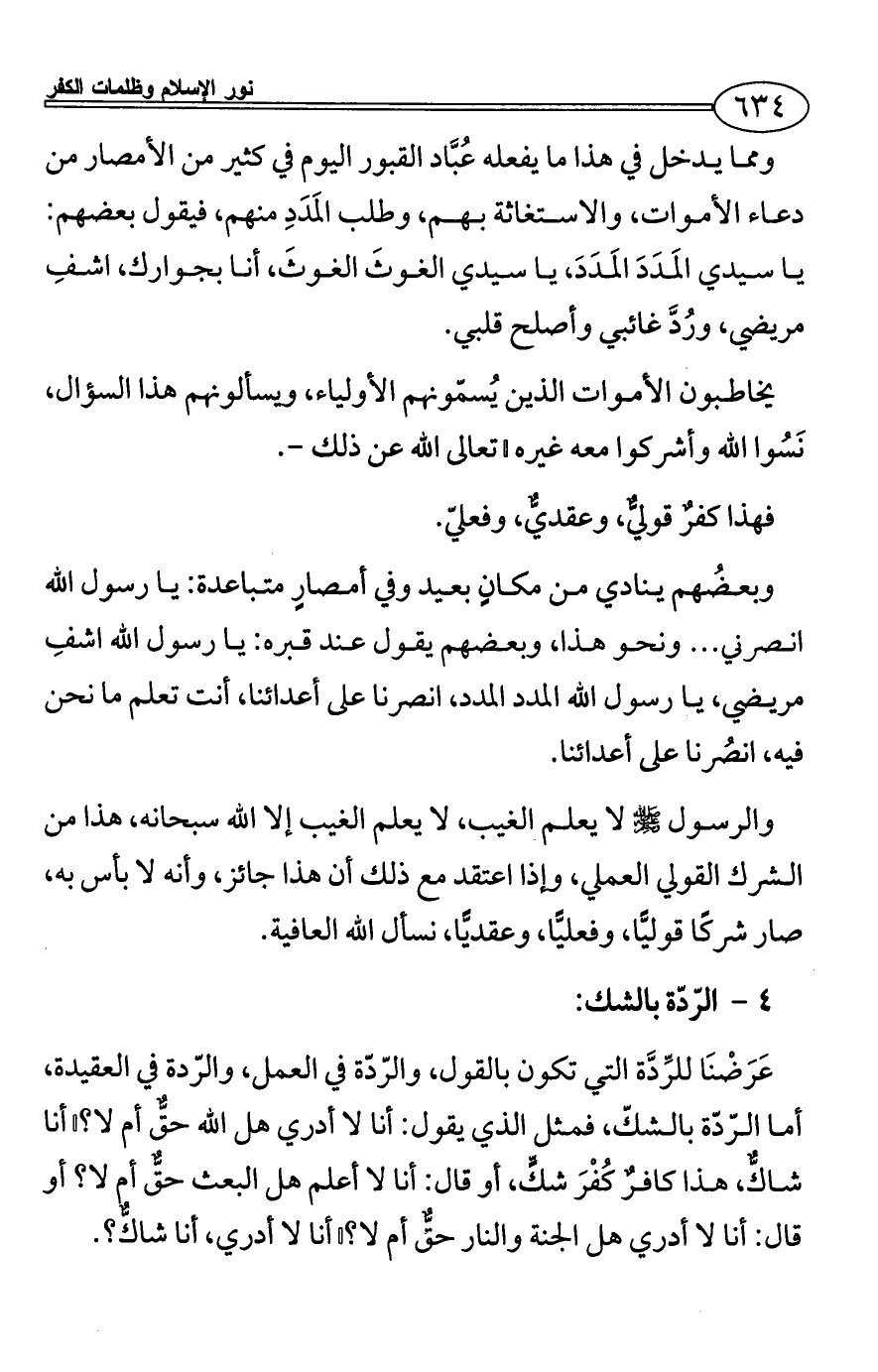 وبعضُهم ينادي من مكانٍ بعيد وفي أمصارٍ متباعدة: يا رسول الله انصرني ... ونحو هذا، وبعضهم يقول عند قبره: يا رسول الله اشفِ مريضي، يا رسول الله المدد المدد، انصرنا على أعدائنا، أنت تعلم ما نحن فيه، انصُرنا على أعدائنا.