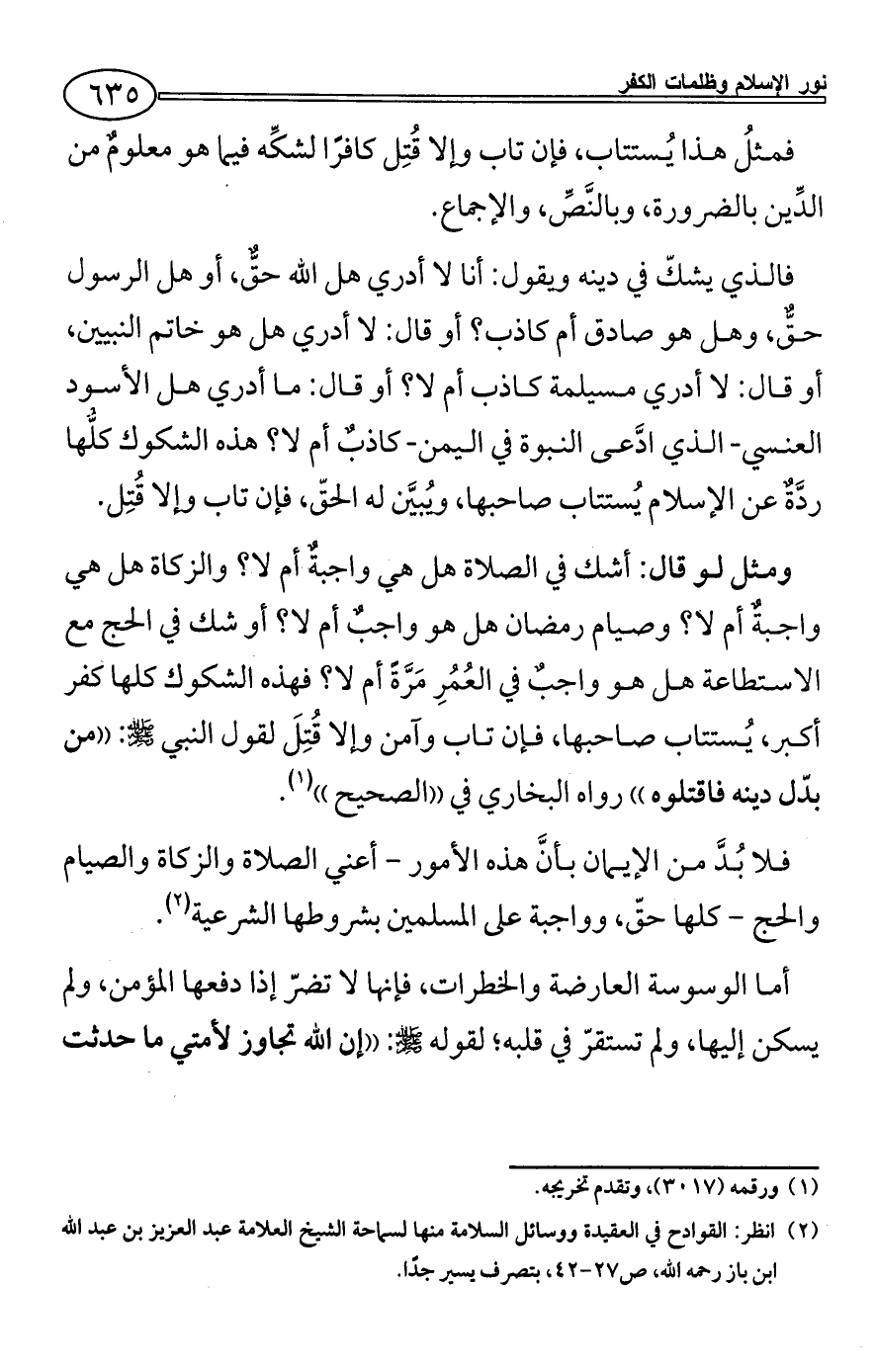فالذي يشكّ في دينه ويقول: أنا لا أدري هل الله حقٌّ، أو هل الرسول حقٌّ، وهل هو صادق أم كاذب؟ أو قال: لا أدري هل هو خاتم النبيين، أو قال: لا أدري مسيلمة كاذب أم لا؟ أو قال: ما أدري هل الأسود العنسي – الذي ادَّعى النبوة في اليمن – كاذبٌ أم لا؟ هذه الشكوك كلُّها ردَّةٌ عن الإسلام يُستتاب صاحبها، ويُبيَّن له الحقّ، فإن تاب وإلا قُتِل.
