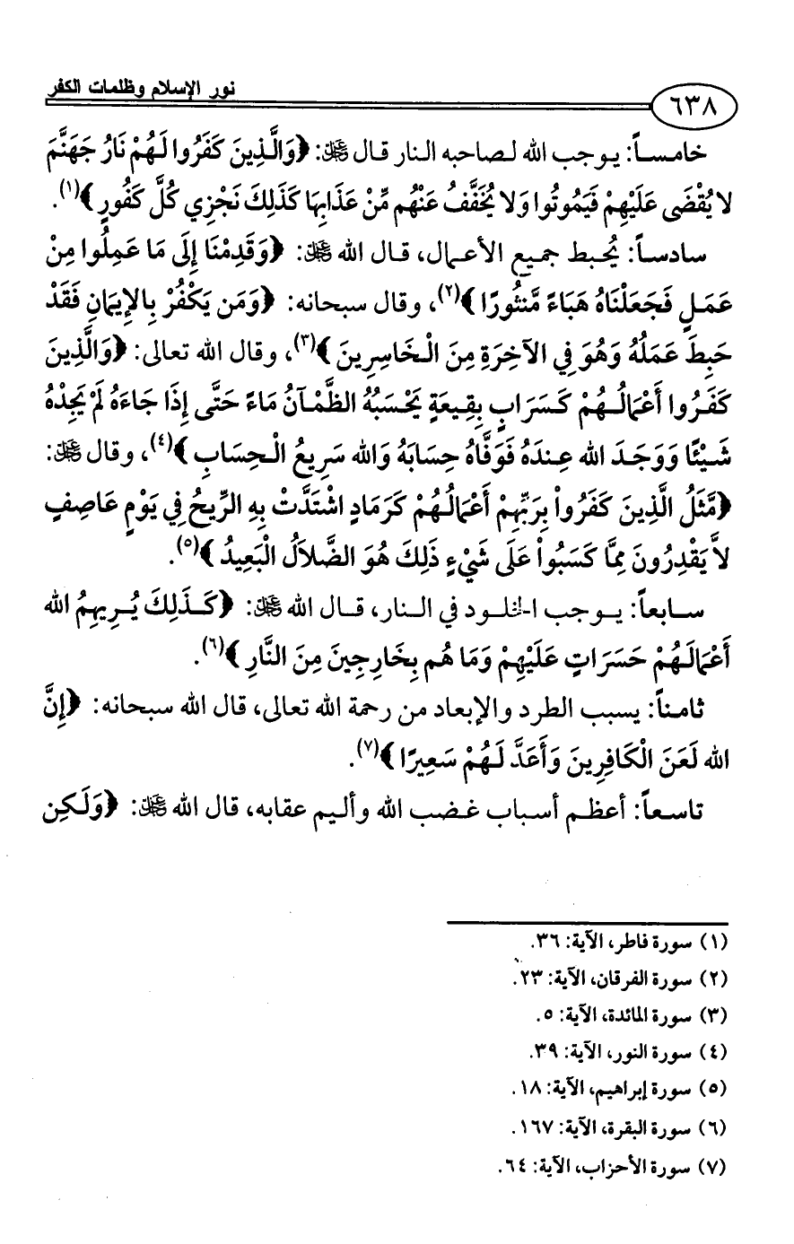 سابعاً: يوجب الخلود في النار، قال الله - عز وجل -: {كَذَلِكَ يُرِيهِمُ الله أَعْمَالَهُمْ حَسَرَاتٍ عَلَيْهِمْ وَمَا هُم بِخَارِجِينَ مِنَ النَّارِ} (¬5).