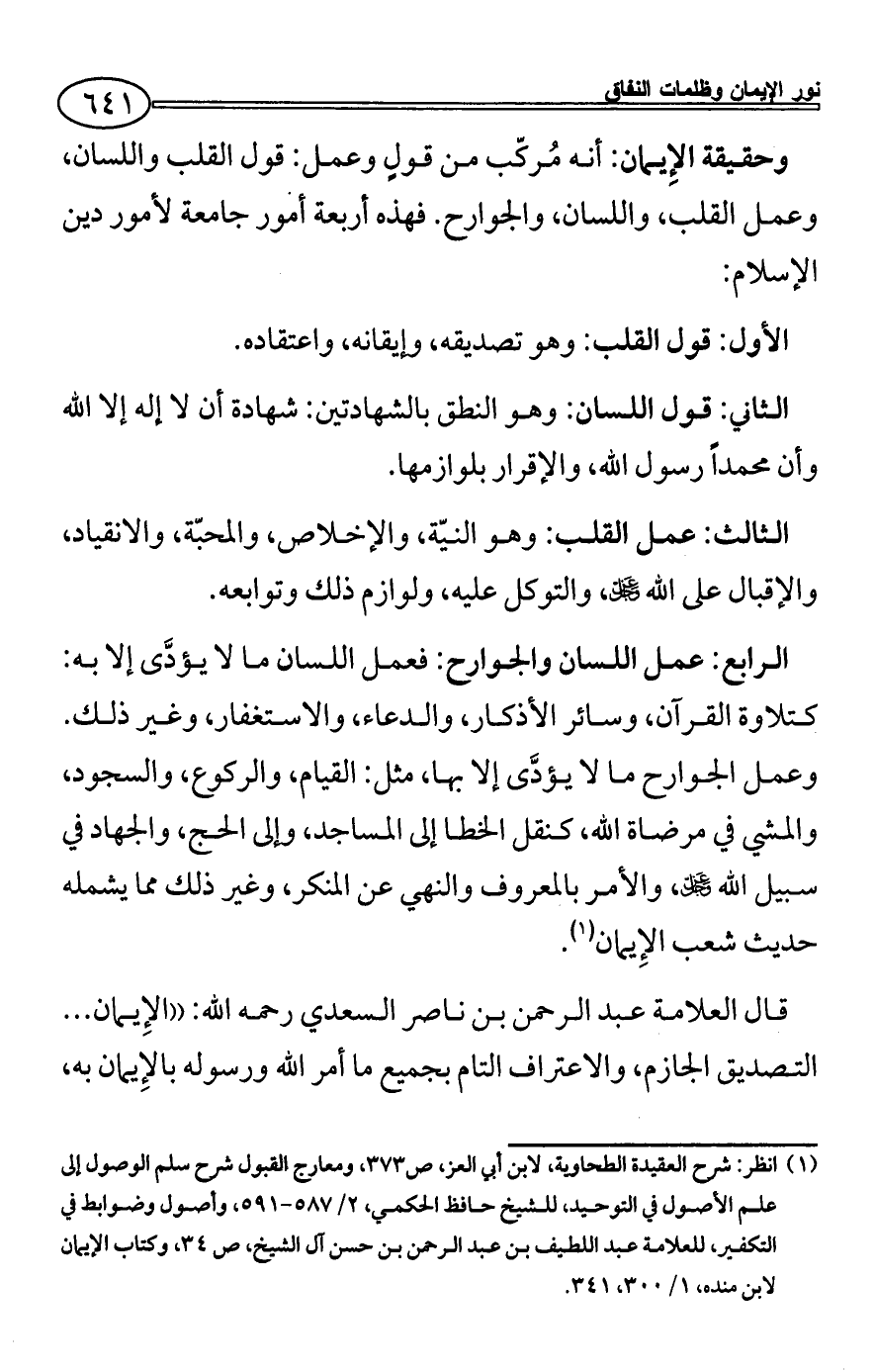 وحقيقة الإِيمان: أنه مُركّب من قولٍ وعمل: قول القلب واللسان، وعمل القلب، واللسان، والجوارح. فهذه أربعة أمور جامعة لأمور دين الإسلام: