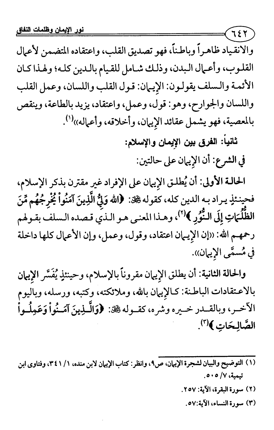 الحالة الأولى: أن يُطلق الإِيمان على الإفراد غير مقترن بذكر الإسلام، فحينئذٍ يراد به الدين كله، كقوله - عز وجل -: {الله وَلِيُّ الَّذِينَ آمَنُواْ يُخْرِجُهُم مِّنَ الظُّلُمَاتِ إِلَى النُّوُرِ} (¬2)، وهذا المعنى هو الذي قصده السلف بقولهم رحمهم الله: ((إن الإِيمان اعتقاد، وقول، وعمل، وإن الأعمال كلها داخلة في مُسمَّى الإِيمان)).