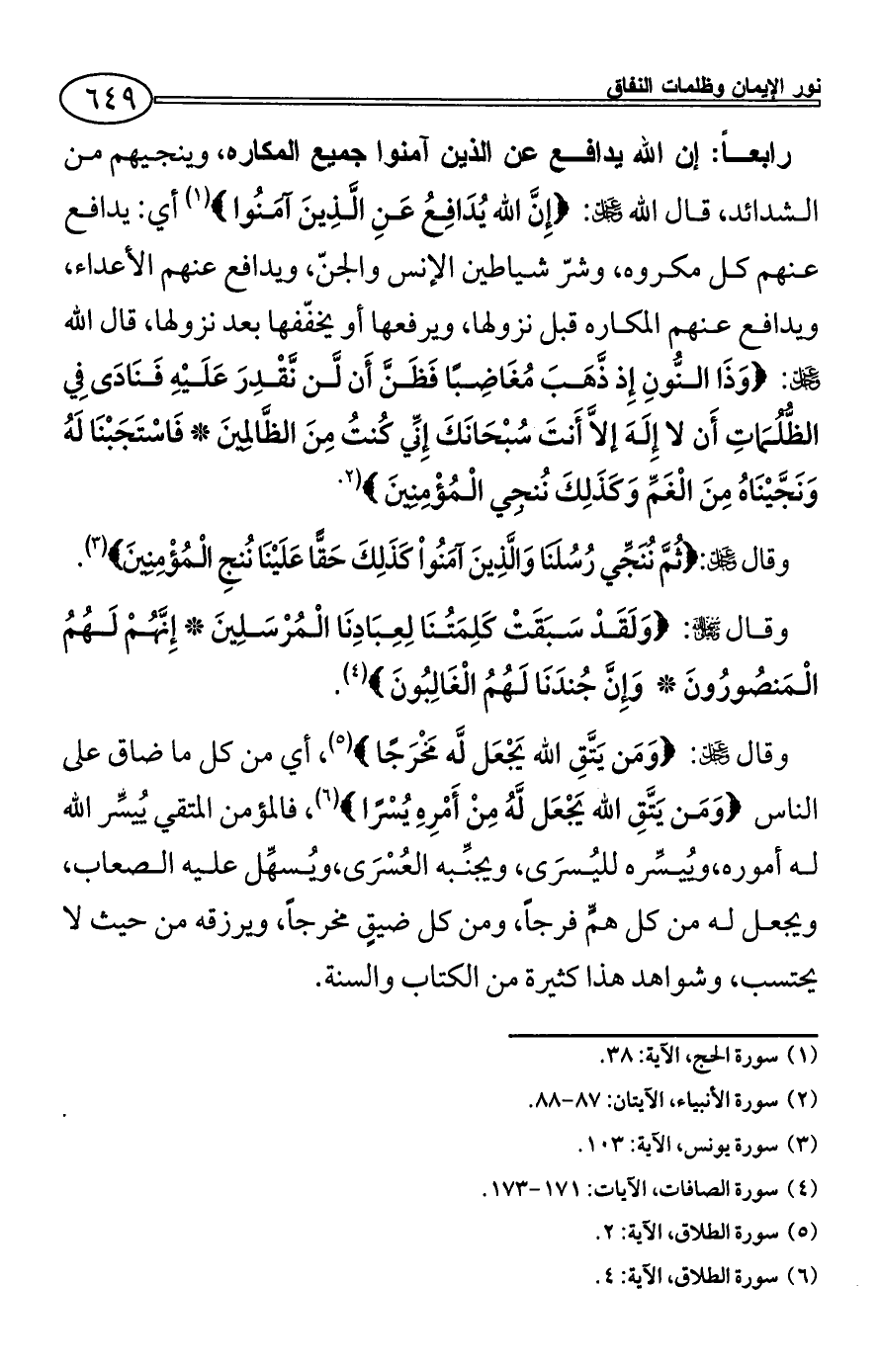 رابعاً: إن الله يدافع عن الذين آمنوا جميع المكاره، وينجيهم من الشدائد، قال الله - عز وجل -: {إِنَّ الله يُدَافِعُ عَنِ الَّذِينَ آمَنُوا} (¬1) أي: يدافع عنهم كل مكروه، وشرّ شياطين الإنس والجنّ، ويدافع عنهم الأعداء، ويدافع عنهم المكاره قبل نزولها، ويرفعها أو يخفّفها بعد نزولها، قال الله - عز وجل -: {وَذَا النُّونِ إِذ ذَّهَبَ مُغَاضِبًا فَظَنَّ أَن لَّن نَّقْدِرَ عَلَيْهِ فَنَادَى فِي الظُّلُمَاتِ أَن لا إِلَهَ إلاَّ أَنتَ سُبْحَانَكَ إِنِّي كُنتُ مِنَ الظَّالِمِينَ * فَاسْتَجَبْنَا لَهُ وَنَجَّيْنَاهُ مِنَ الْغَمِّ وَكَذَلِكَ نُنجِي الْمُؤْمِنِينَ} (¬2).