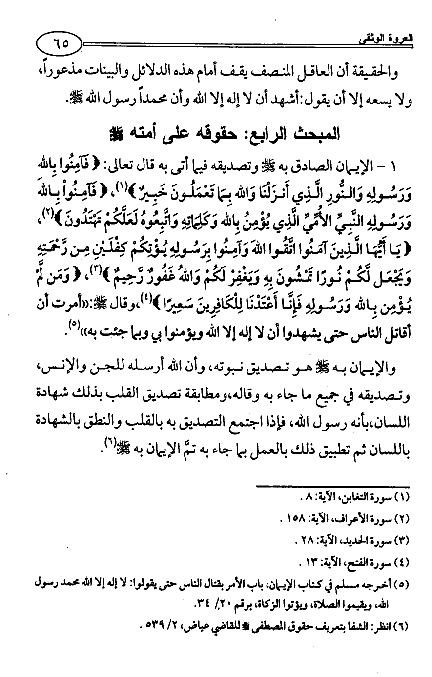 1 - الإيمان الصادق به - صلى الله عليه وسلم - وتصديقه فيما أتى به قال تعالى: {فَآمِنُوا بِالله وَرَسُولِهِ وَالنُّورِ الَّذِي أَنزَلْنَا وَالله بِمَا تَعْمَلُونَ خَبِيرٌ} (¬1)، {فَآمِنُواْ بِالله وَرَسُولِهِ النَّبِيِّ الأُمِّيِّ الَّذِي يُؤْمِنُ بِالله وَكَلِمَاتِهِ وَاتَّبِعُوهُ لَعَلَّكُمْ تَهْتَدُونَ} (¬2)، {يَا أَيُّهَا الَّذِينَ آمَنُوا اتَّقُوا الله وَآمِنُوا بِرَسُولِهِ يُؤْتِكُمْ كِفْلَيْنِ مِن رَّحْمَتِهِ وَيَجْعَل لَّكُمْ نُورًا تَمْشُونَ بِهِ وَيَغْفِرْ لَكُمْ وَالله غَفُورٌ رَّحِيمٌ} (¬3)، {وَمَن لَّمْ يُؤْمِن بِالله وَرَسُولِهِ فَإِنَّا أَعْتَدْنَا لِلْكَافِرِينَ سَعِيرًا} (¬4)،وقال - صلى الله عليه وسلم -: ((أمرت أن أقاتل الناس حتى يشهدوا أن لا إله إلا الله ويؤمنوا بي وبما جئت به)) (¬5).