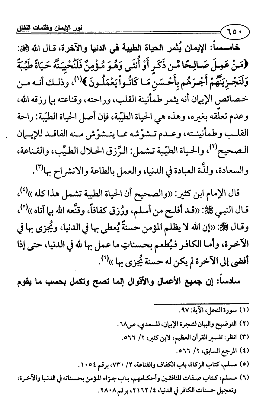 قال الإمام ابن كثير: ((والصحيح أن الحياة الطيبة تشمل هذا كله)) (¬4) , قال النبي - صلى الله عليه وسلم -: ((قد أفلح من أسلم، ورُزق كفافاً، وقنَّعه الله بما آتاه)) (¬5) , وقال - صلى الله عليه وسلم -: ((إن الله لا يظلم المؤمن حسنةً يُعطى بها في الدنيا، ويُجزى بها في الآخرة، وأما الكافر فيُطعم بحسناتِ ما عمل بها لله في الدنيا، حتى إذا أفضى إلى الآخرة لم يكن له حسنة يُجزى بها)) (¬6).