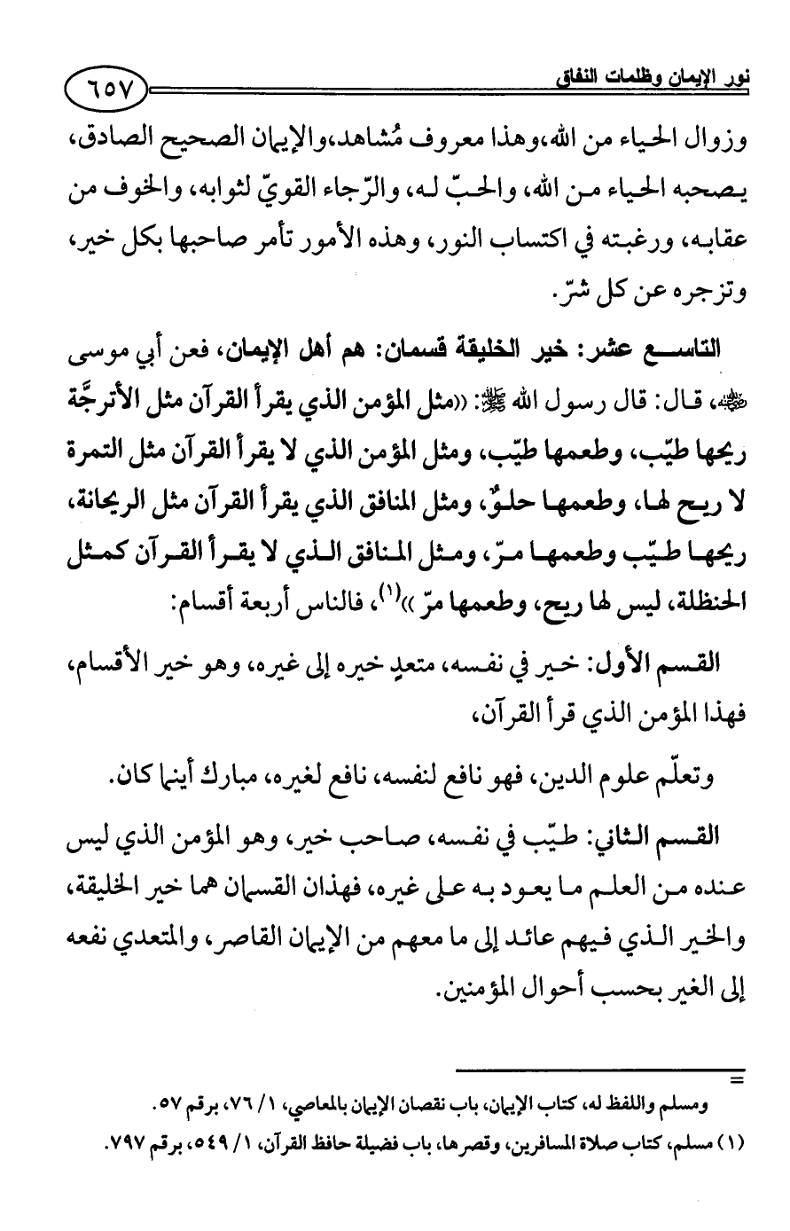 التاسع عشر: خير الخليقة قسمان: هم أهل الإيمان، فعن أبي موسى - رضي الله عنه -، قال: قال رسول الله - صلى الله عليه وسلم -: ((مثل المؤمن الذي يقرأ القرآن مثل الأترجَّة ريحها طيّب، وطعمها طيّب، ومثل المؤمن الذي لا يقرأ القرآن مثل التمرة لا ريح لها، وطعمها حلوٌ، ومثل المنافق الذي يقرأ القرآن مثل الريحانة، ريحها طيّب وطعمها مرّ، ومثل المنافق الذي لا يقرأ القرآن كمثل الحنظلة، ليس لها ريح، وطعمها مرّ)) (¬1) , فالناس أربعة أقسام: