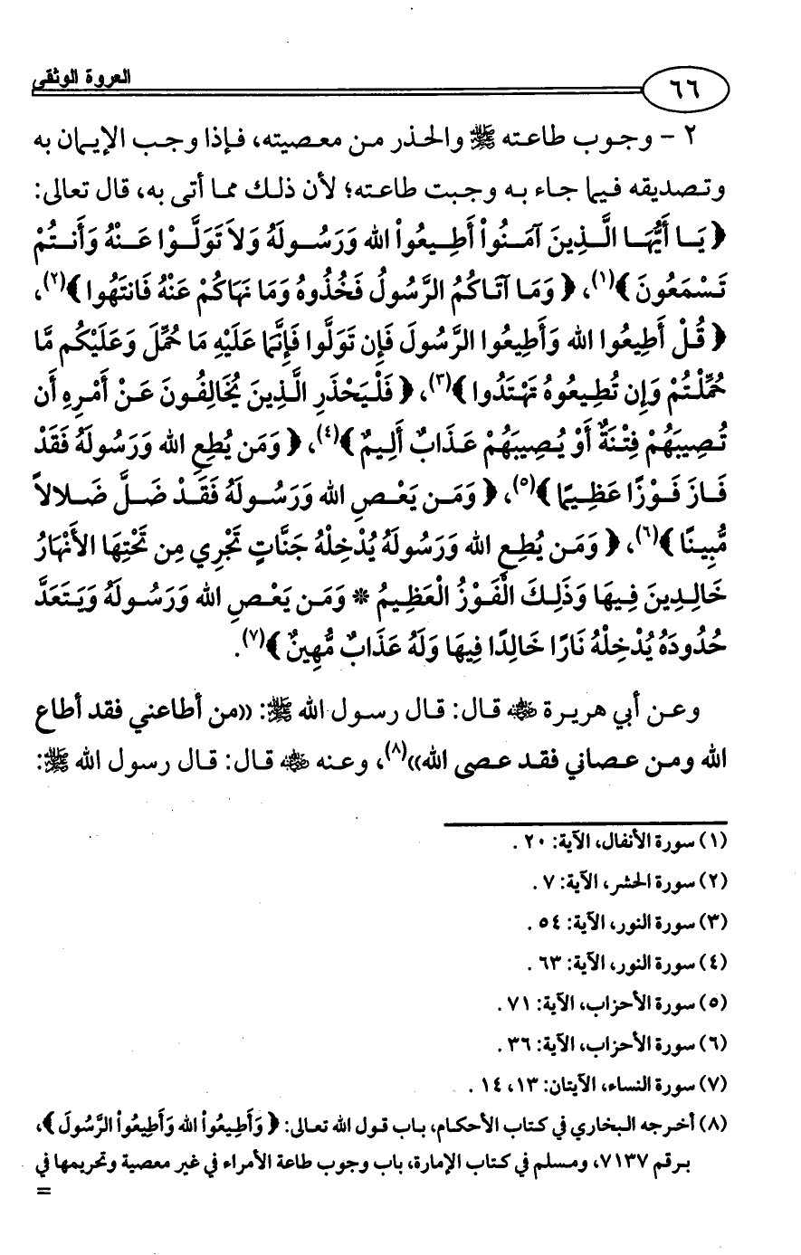(¬8) أخرجه البخاري في كتاب الأحكام، باب قول الله تعالى: {وَأَطِيعُواْ الله وَأَطِيعُواْ الرَّسُولَ}، برقم 7137، ومسلم في كتاب الإمارة، باب وجوب طاعة الأمراء في غير معصية وتحريمها في المعصية، برقم 1835.