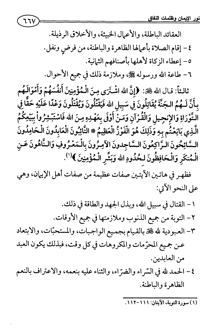 ثالثاً: قال الله - عز وجل -: {إِنَّ الله اشْتَرَى مِنَ الْمُؤْمِنِينَ أَنفُسَهُمْ وَأَمْوَالَهُم بِأَنَّ لَهُمُ الجَنَّةَ يُقَاتِلُونَ فِي سَبِيلِ الله فَيَقْتُلُونَ وَيُقْتَلُونَ وَعْدًا عَلَيْهِ حَقًّا فِي التَّوْرَاةِ وَالإِنجِيلِ وَالْقُرْآنِ وَمَنْ أَوْفَى بِعَهْدِهِ مِنَ الله فَاسْتَبْشِرُواْ بِبَيْعِكُمُ الَّذِي بَايَعْتُم بِهِ وَذَلِكَ هُوَ الْفَوْزُ الْعَظِيمُ * التَّائِبُونَ الْعَابِدُونَ الْحَامِدُونَ السَّائِحُونَ الرَّاكِعُونَ السَّاجِدونَ الآمِرُونَ بِالْمَعْرُوفِ وَالنَّاهُونَ عَنِ الْمُنكَرِ وَالْحَافِظُونَ لِحُدُودِ الله وَبَشِّرِ الْمُؤْمِنِينَ} (¬1).