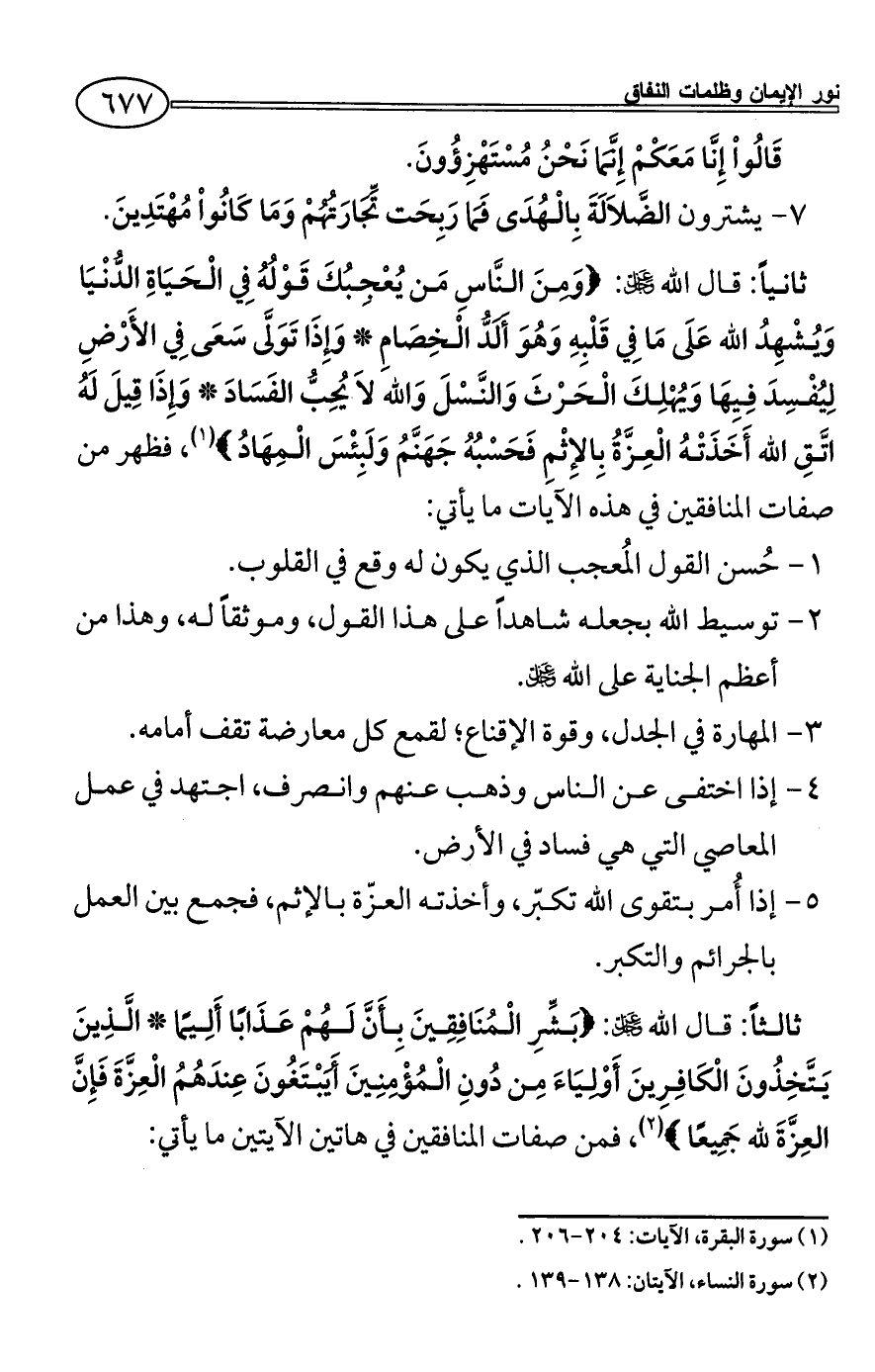ثانياً: قال الله - عز وجل -: {وَمِنَ النَّاسِ مَن يُعْجِبُكَ قَوْلُهُ فِي الْحَيَاةِ الدُّنْيَا وَيُشْهِدُ الله عَلَى مَا فِي قَلْبِهِ وَهُوَ أَلَدُّ الْخِصَامِ * وَإِذَا تَوَلَّى سَعَى فِي الأَرْضِ لِيُفْسِدَ فِيِهَا وَيُهْلِكَ الْحَرْثَ وَالنَّسْلَ وَالله لاَ يُحِبُّ الفَسَادَ * وَإِذَا قِيلَ لَهُ اتَّقِ الله أَخَذَتْهُ الْعِزَّةُ بِالإِثْمِ فَحَسْبُهُ جَهَنَّمُ وَلَبِئْسَ الْمِهَادُ} (¬1)، فظهر من صفات المنافقين في هذه الآيات ما يأتي: