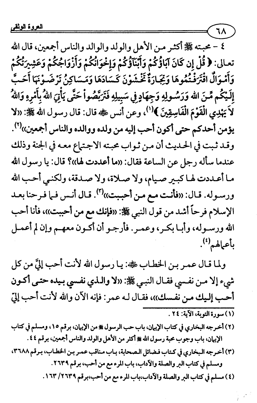 تعالى: {قُلْ إِن كَانَ آبَاؤُكُمْ وَأَبْنَآؤُكُمْ وَإِخْوَانُكُمْ وَأَزْوَاجُكُمْ وَعَشِيرَتُكُمْ وَأَمْوَالٌ اقْتَرَفْتُمُوهَا وَتِجَارَةٌ تَخْشَوْنَ كَسَادَهَا وَمَسَاكِنُ تَرْضَوْنَهَا أَحَبَّ إِلَيْكُم مِّنَ الله وَرَسُولِهِ وَجِهَادٍ فِي سَبِيلِهِ فَتَرَبَّصُواْ حَتَّى يَأْتِيَ الله بِأَمْرِهِ وَالله لاَ يَهْدِي الْقَوْمَ الْفَاسِقِينَ} (¬1)،وعن أنس - رضي الله عنه - قال: قال رسول الله - صلى الله عليه وسلم -: ((لا يؤمن أحدكم حتى أكون أحب إليه من ولده ووالده والناس أجمعين)) (¬2). وقد ثبت في الحديث أن من ثواب محبته الاجتماع معه في الجنة وذلك عندما سأله رجل عن الساعة فقال: ((ما أعددت لها))؟ قال: يا رسول الله ما أعددت لها كبير صيام، ولا صلاة، ولا صدقة، ولكني أحب الله ورسوله. قال: ((فأنت مع من أحببت)) (¬3).قال أنس فما فرحنا بعد الإسلام فرحاً أشد من قول النبي - صلى الله عليه وسلم -: ((فإنك مع من أحببت))،فأنا أحب الله ورسوله، وأبا بكر، وعمر. فأرجو أن أكون معهم وإن لم أعمل بأعمالهم (¬4).