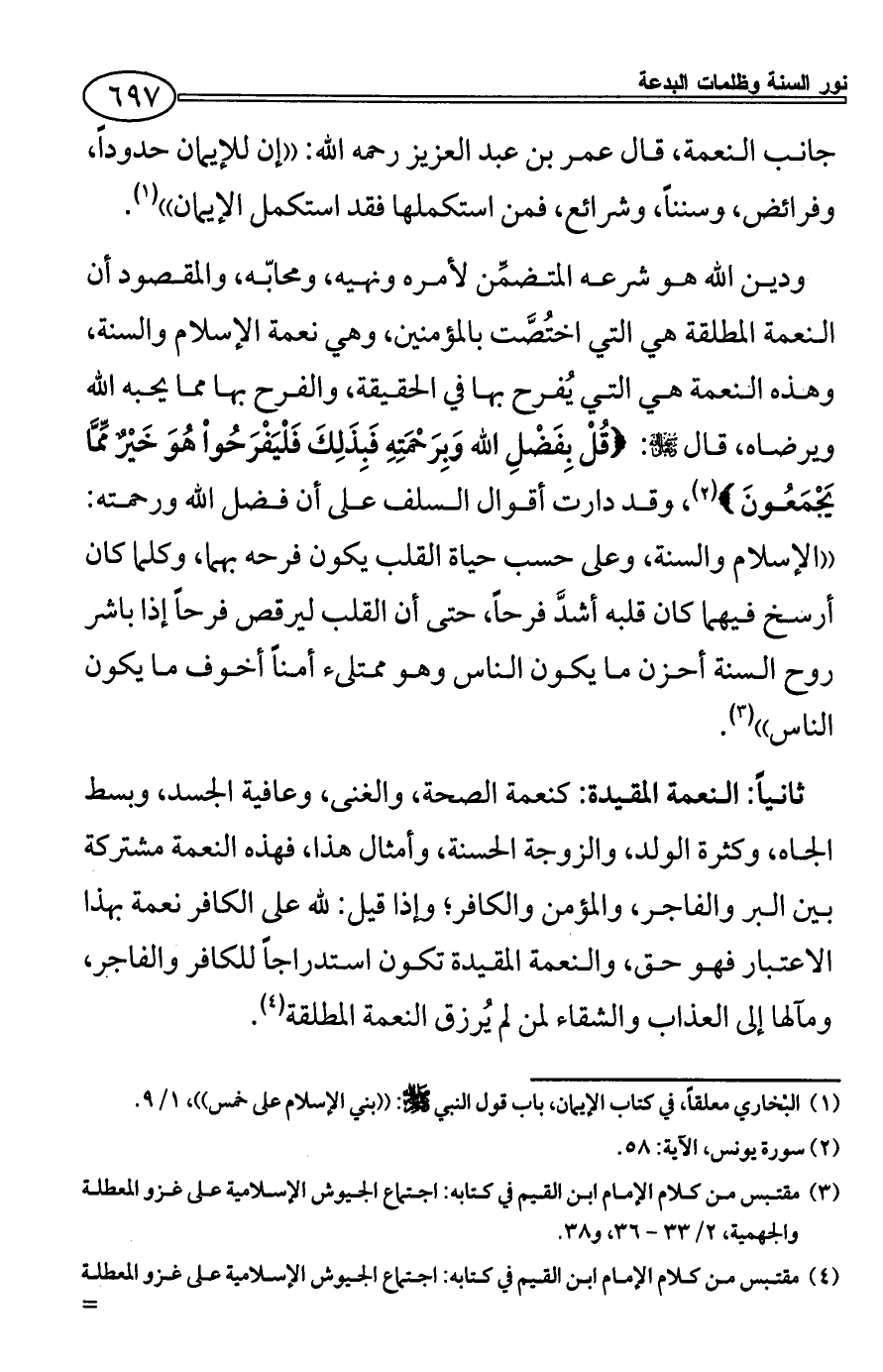 ودين الله هو شرعه المتضمِّن لأمره ونهيه، ومحابّه، والمقصود أن النعمة المطلقة هي التي اختُصَّت بالمؤمنين، وهي نعمة الإسلام والسنة، وهذه النعمة هي التي يُفرح بها في الحقيقة، والفرح بها مما يحبه الله ويرضاه، قال - سبحانه وتعالى -: {قُلْ بِفَضْلِ الله وَبِرَحْمَتِهِ فَبِذَلِكَ فَلْيَفْرَحُواْ هُوَ خَيْرٌ مِّمَّا يَجْمَعُونَ} (¬2)، وقد دارت أقوال السلف على أن فضل الله ورحمته: ((الإسلام والسنة، وعلى حسب حياة القلب يكون فرحه بهما، وكلما كان أرسخ فيهما كان قلبه أشدَّ فرحاً، حتى أن القلب ليرقص فرحاً إذا باشر روح السنة أحزن ما يكون الناس وهو ممتلىء أمناً أخوف ما يكون الناس)) (¬3).