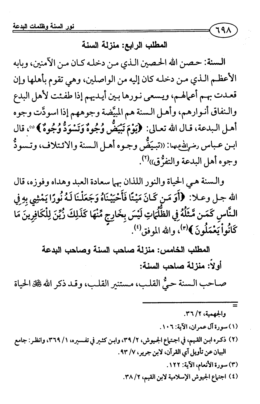 والسنة هي الحياة والنور اللذان بهما سعادة العبد وهداه وفوزه، قال الله جل وعلا: {أَوَ مَن كَانَ مَيْتًا فَأَحْيَيْنَاهُ وَجَعَلْنَا لَهُ نُورًا يَمْشِي بِهِ فِي النَّاسِ كَمَن مَّثَلُهُ فِي الظُّلُمَاتِ لَيْسَ بِخَارِجٍ مِّنْهَا كَذَلِكَ زُيِّنَ لِلْكَافِرِينَ مَا كَانُواْ يَعْمَلُونَ} (¬3)، والله الموفق (¬4).