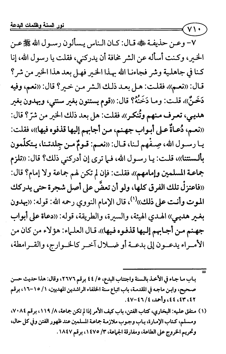 7 - وعن حذيفة - رضي الله عنه - قال: كان الناس يسألون رسول الله - صلى الله عليه وسلم - عن الخير، وكنت أسأله عن الشر مخافة أن يدركني، فقلت يا رسول الله، إنا كنا في جاهلية وشر فجاءنا الله بهذا الخير فهل بعد هذا الخير من شر؟ قال: ((نعم))، فقلت: هل بعد ذلك الشر من خير؟ قال: ((نعم، وفيه دَخَنٌ))، قلت: وما دَخَنُهُ؟ قال: ((قوم يستنون بغير سنتي، ويهدون بغير هديي، تعرف منهم وتُنكر))، فقلت: هل بعد ذلك الخير من شرّ؟ قال: ((نعم، دُعاةٌ على أبواب جهنم، من أجابهم إليها قذفوه فيها))، فقلت: