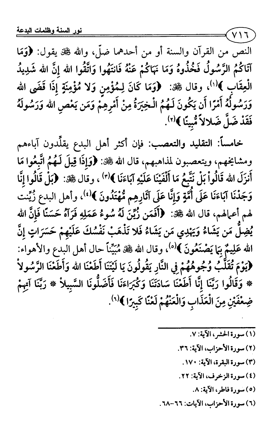 خامساً: التقليد والتعصب: فإن أكثر أهل البدع يقلِّدون آباءهم ومشايخهم، ويتعصبون لمذاهبهم، قال الله - عز وجل -: {وَإِذَا قِيلَ لَهُمُ اتَّبِعُوا مَا أَنزَلَ الله قَالُواْ بَلْ نَتَّبِعُ مَا أَلْفَيْنَا عَلَيْهِ آبَاءَنَا} (¬3)، وقال - عز وجل -: {بَلْ قَالُوا إِنَّا وَجَدْنَا آبَاءَنَا عَلَى أُمَّةٍ وَإِنَّا عَلَى آثَارِهِم مُّهْتَدُونَ} (¬4)، وأهل البدع زُيِّنت لهم أعمالهم، قال الله - عز وجل -: {أَفَمَن زُيِّنَ لَهُ سُوءُ عَمَلِهِ فَرَآهُ حَسَنًا فَإِنَّ الله يُضِلُّ مَن يَشَاءُ وَيَهْدِي مَن يَشَاءُ فَلا تَذْهَبْ نَفْسُكَ عَلَيْهِمْ حَسَرَاتٍ إِنَّ الله عَلِيمٌ بِمَا يَصْنَعُونَ} (¬5)، وقال الله - عز وجل - مُبَيِّناً حال أهل البدع والأهواء: {يَوْمَ تُقَلَّبُ وُجُوهُهُمْ فِي النَّارِ يَقُولُونَ يَا لَيْتَنَا أَطَعْنَا الله وَأَطَعْنَا الرَّسُولاْ * وَقَالُوا رَبَّنَا إِنَّا أَطَعْنَا سَادَتَنَا وَكُبَرَاءَنَا فَأَضَلُّونَا السَّبِيلاْ * رَبَّنَا آتِهِمْ ضِعْفَيْنِ مِنَ الْعَذَابِ وَالْعَنْهُمْ لَعْنًا كَبِيرًا} (¬6).