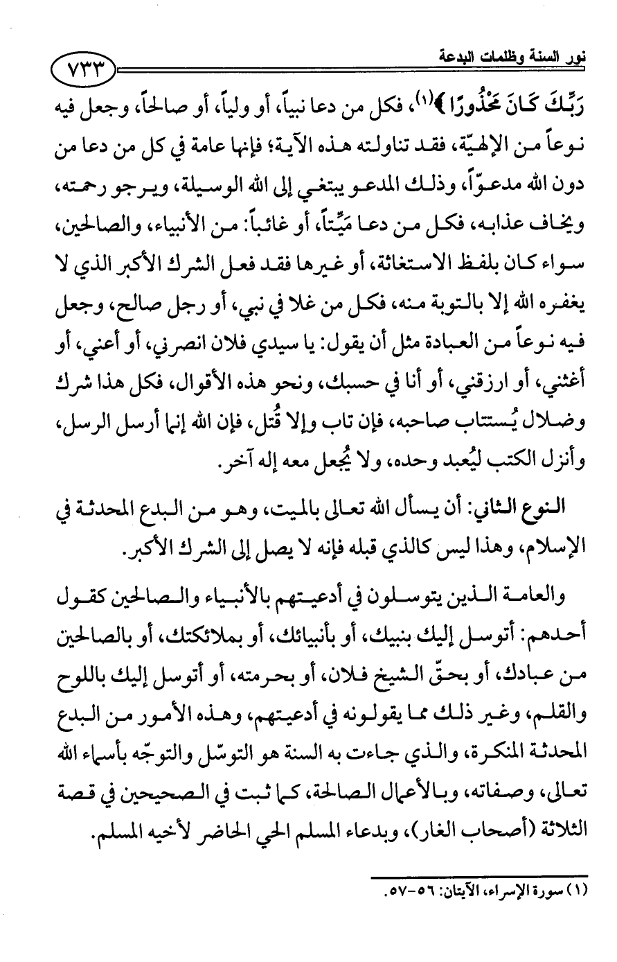 نوعاً من الإلهيّة، فقد تناولته هذه الآية؛ فإنها عامة في كل من دعا من دون الله مدعوّاً، وذلك المدعو يبتغي إلى الله الوسيلة، ويرجو رحمته، ويخاف عذابه، فكل من دعا مَيِّتاً، أو غائباً: من الأنبياء، والصالحين، سواء كان بلفظ الاستغاثة، أو غيرها فقد فعل الشرك الأكبر الذي لا يغفره الله إلا بالتوبة منه، فكل من غلا في نبي، أو رجل صالح، وجعل فيه نوعاً من العبادة مثل أن يقول: يا سيدي فلان انصرني، أو أعني، أو أغثني، أو ارزقني، أو أنا في حسبك، ونحو هذه الأقوال، فكل هذا شرك وضلال يُستتاب صاحبه، فإن تاب وإلا قُتل، فإن الله إنما أرسل الرسل، وأنزل الكتب ليُعبد وحده، ولا يُجعل معه إله آخر.